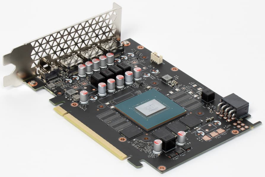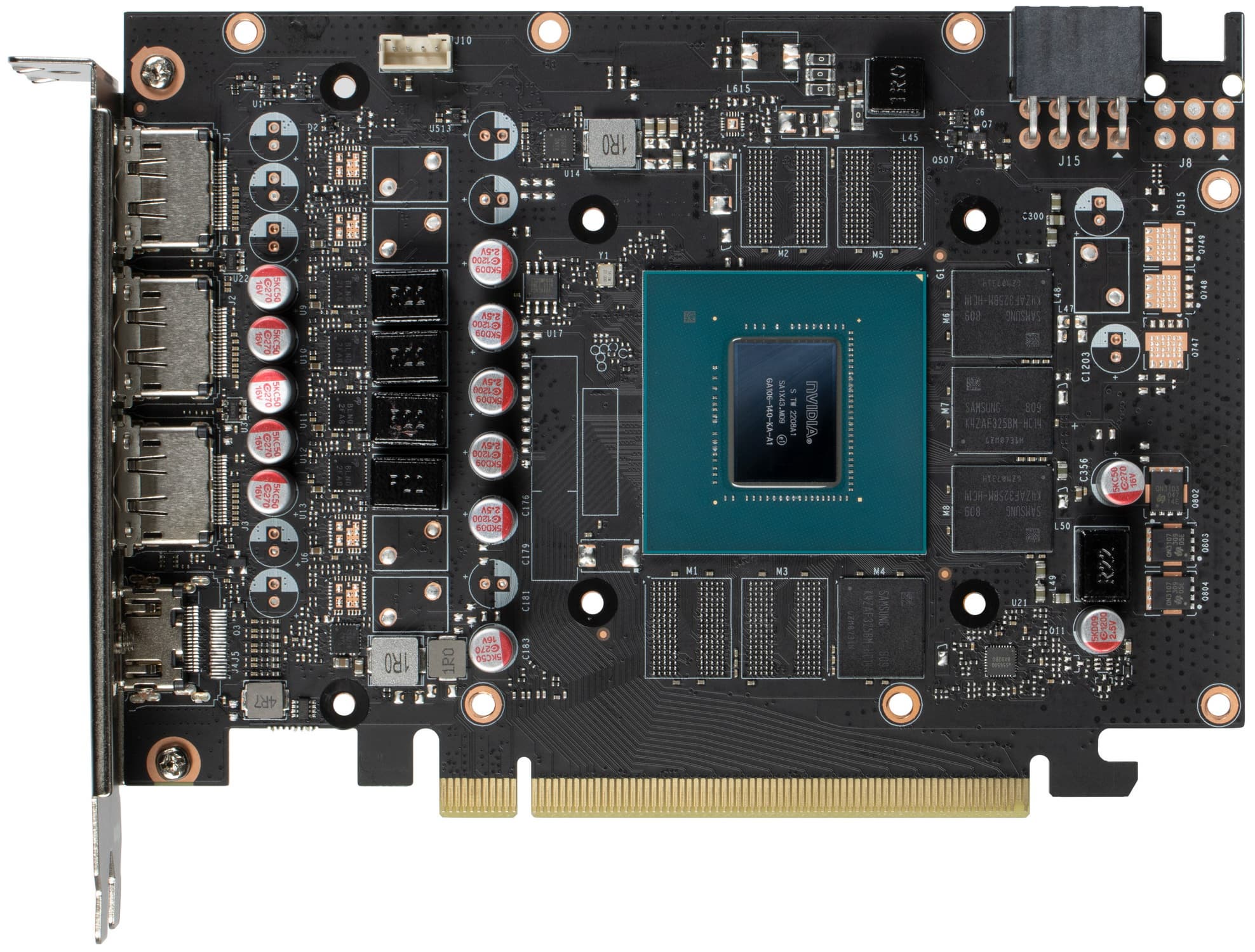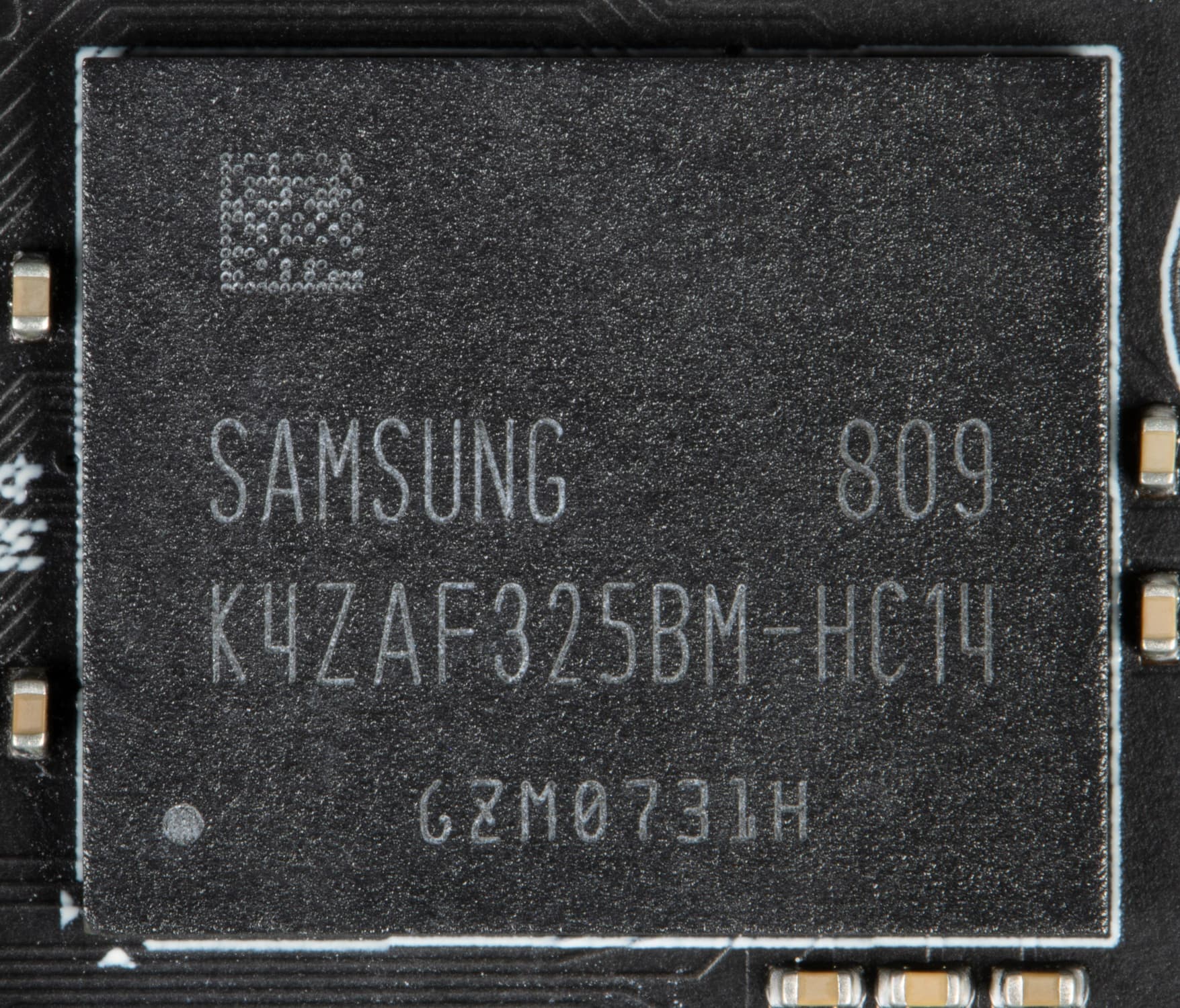 Карта имеет 8 ГБ памяти GDDR6 SDRAM, размещенной в 4 микросхемах по 16 Гбит на лицевой стороне PCB. Микросхемы памяти Samsung рассчитаны на условную номинальную частоту работы в 3500 (14000) МГц.