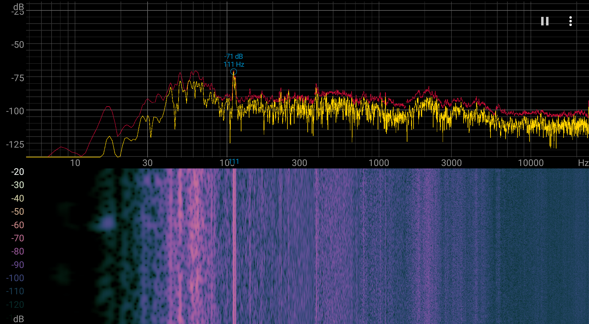 Спектрограмма демонстрирует пару низкочастотных пиков, проявляющихся в виде гудения (но раздражающим этот шум назвать нельзя).