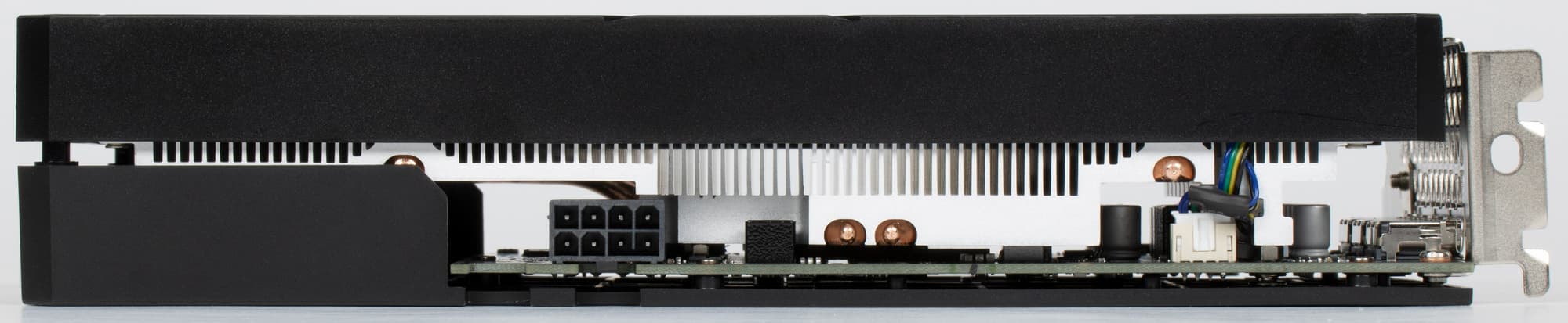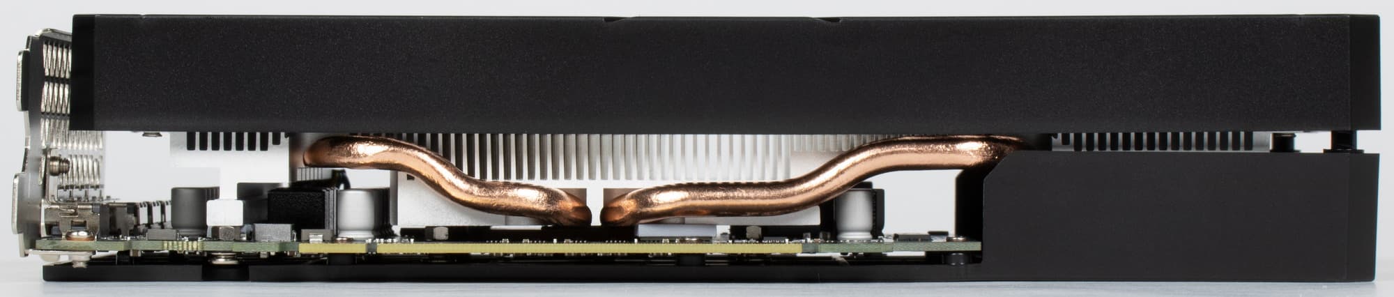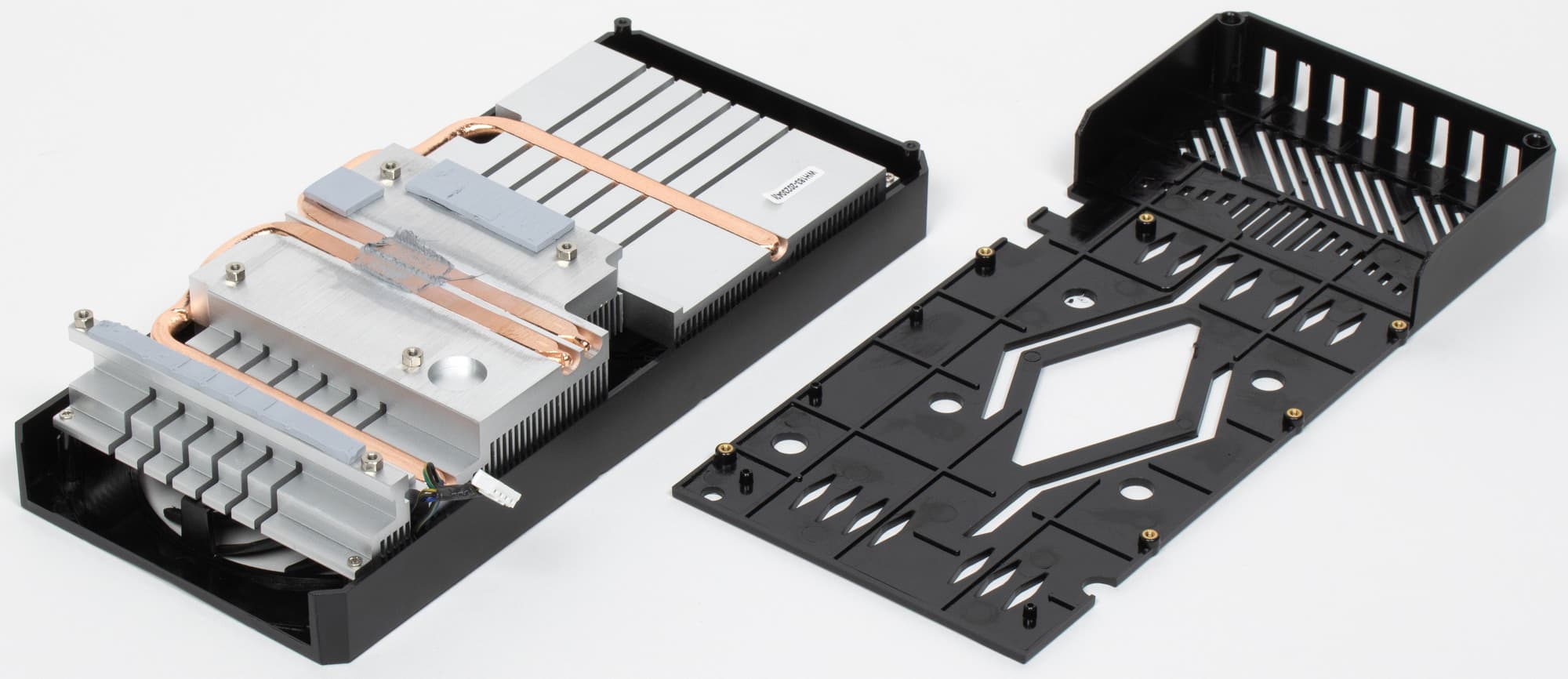Трубки впрессованы в радиатор и напрямую контактируют с GPU. Микросхемы памяти охлаждаются той же подошвой (через термопрокладки). А для охлаждения преобразователей питания VRM имеется отдельная подошва.
