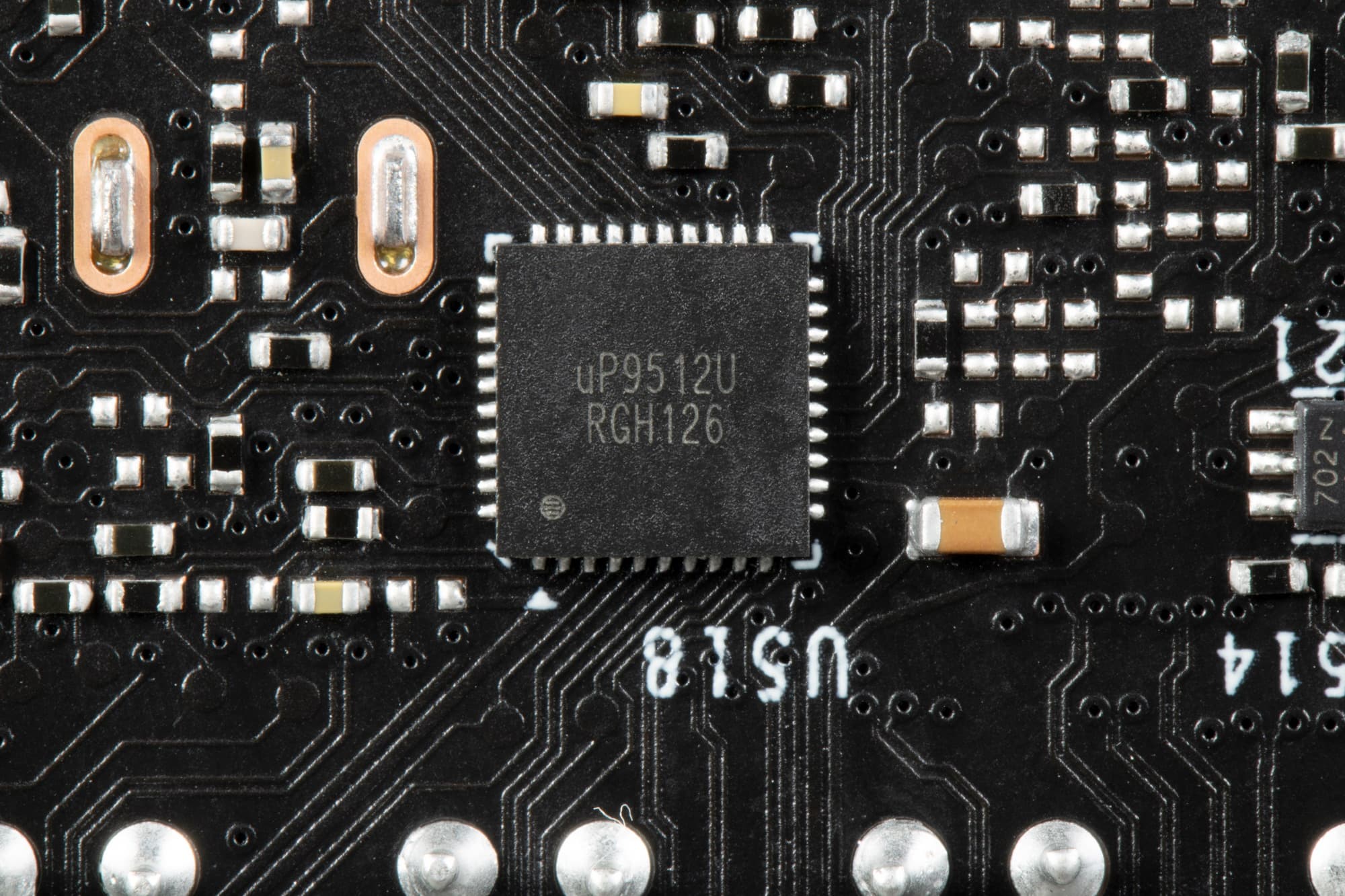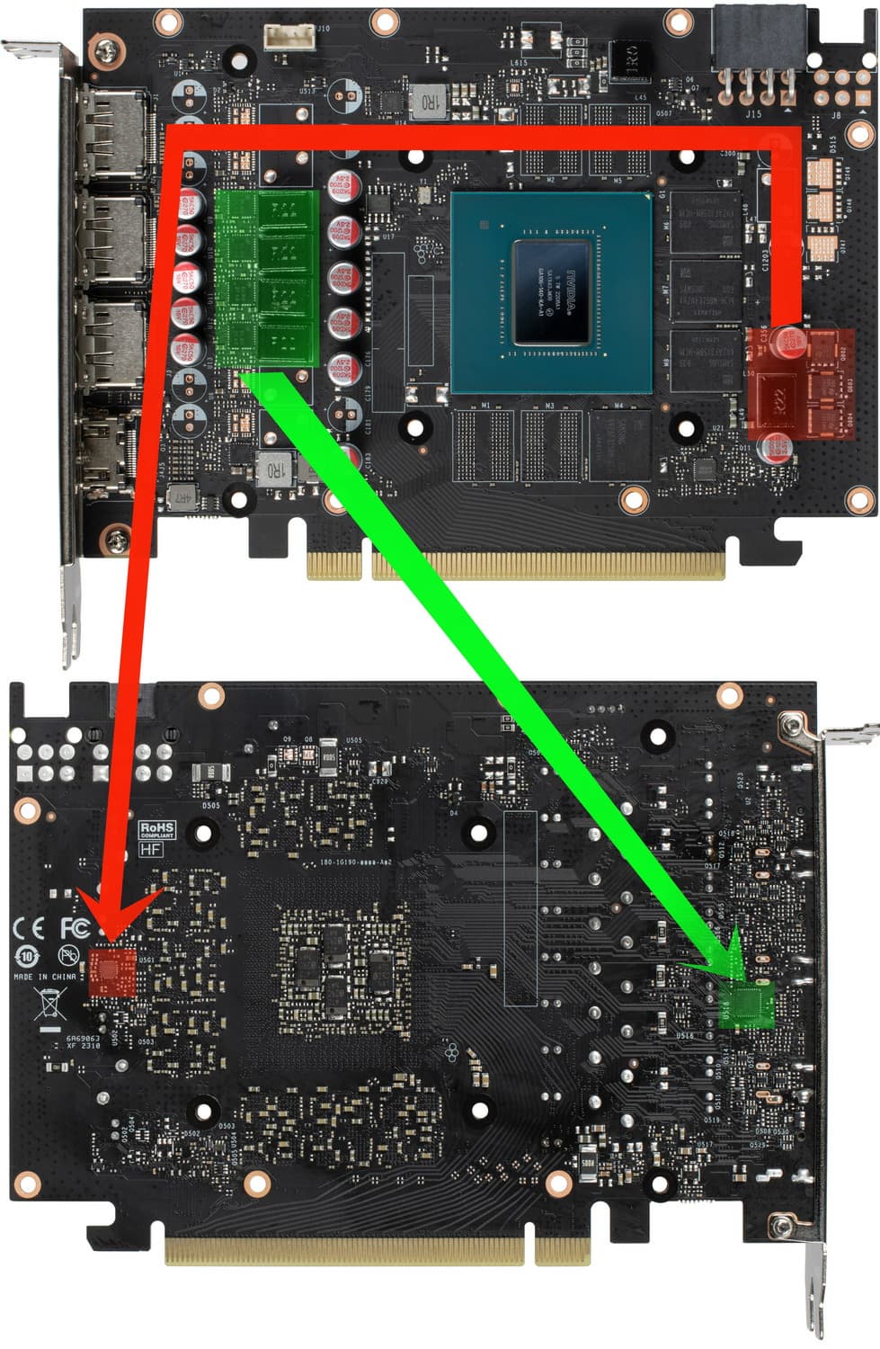 Зеленым цветом отмечены фазы питания графического ядра, а также их ШИМ-контроллер, а красным — то же для микросхем памяти. Для управления схемой питания ядра используется ШИМ-контроллер uP9512U (uPI Semiconductor), он расположен на оборотной стороне платы.