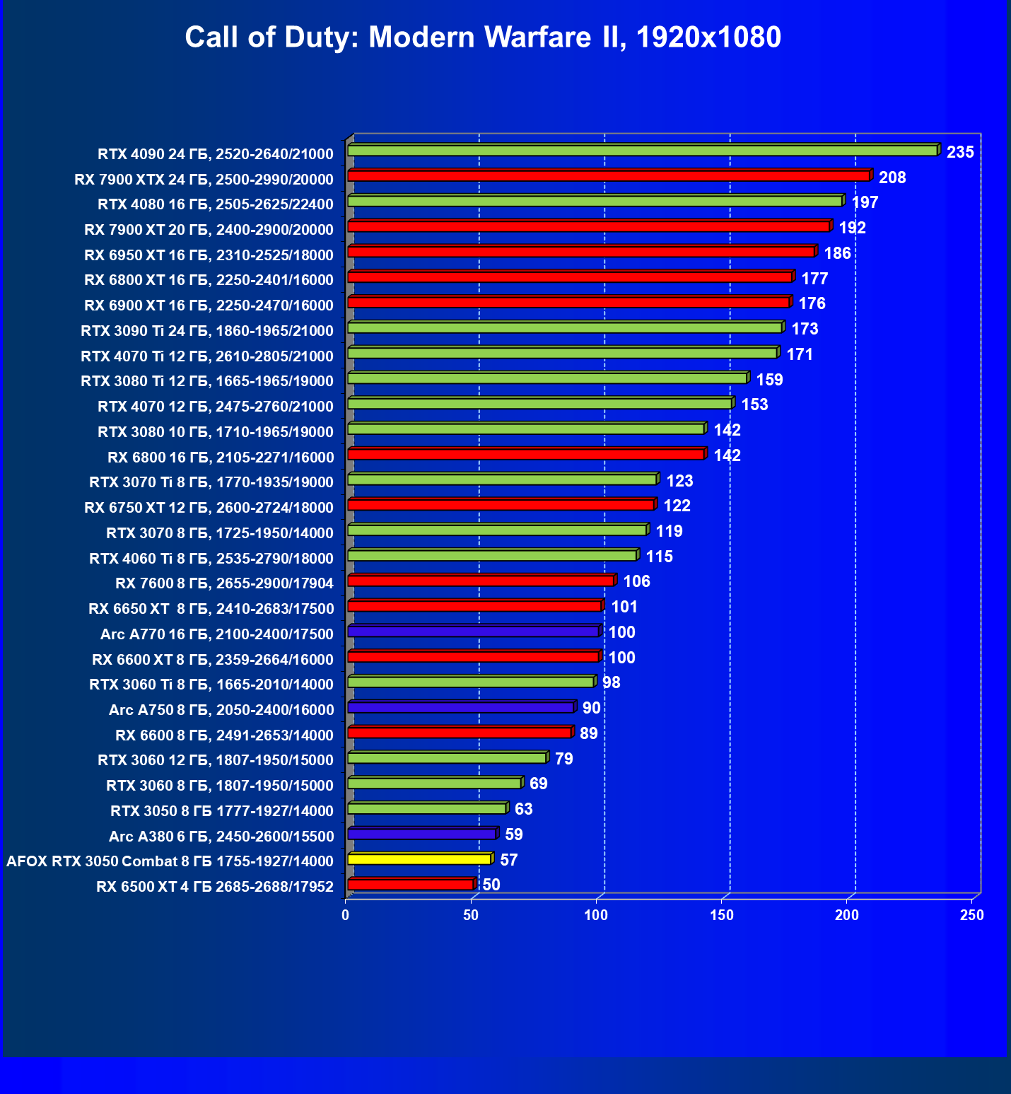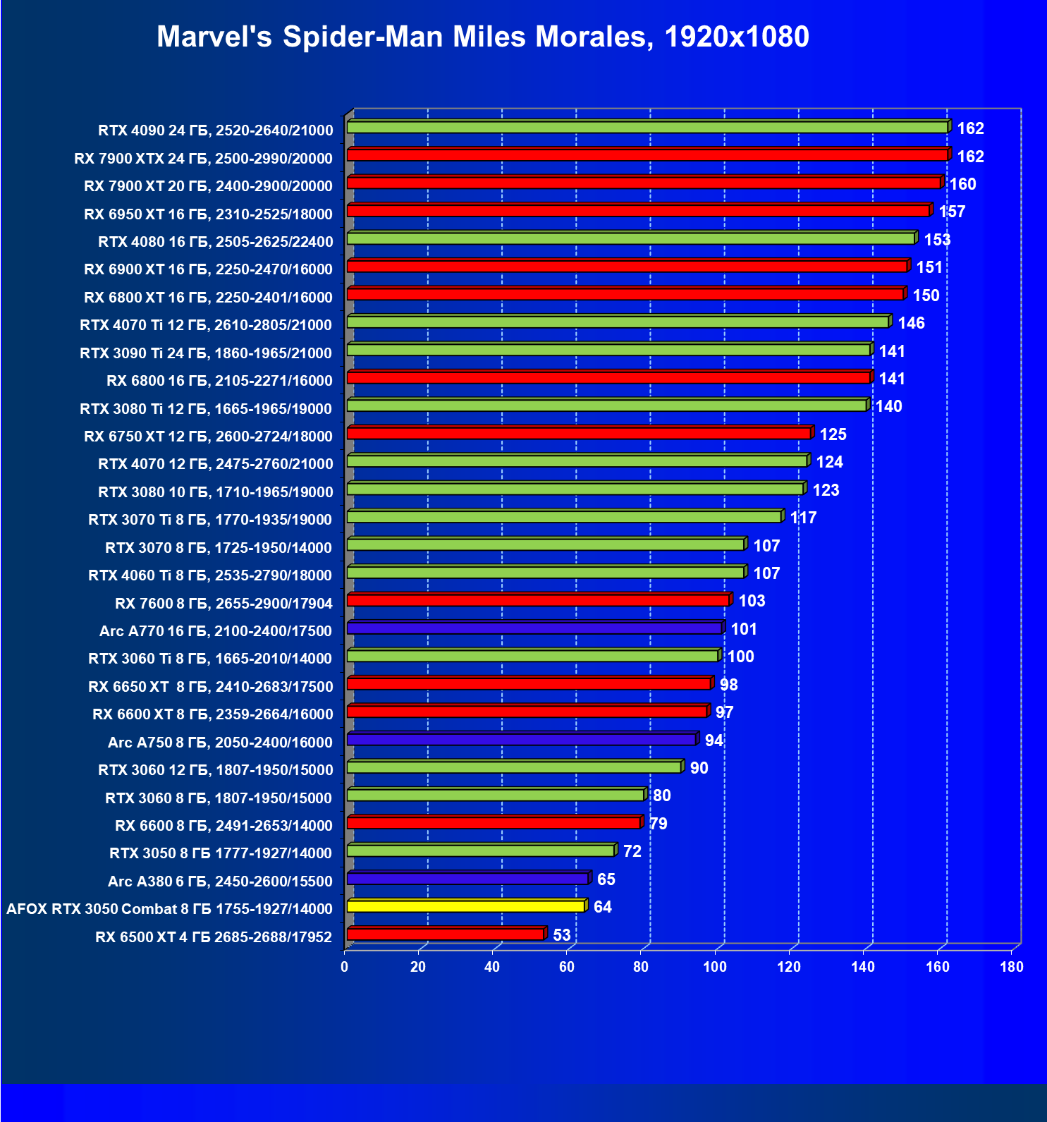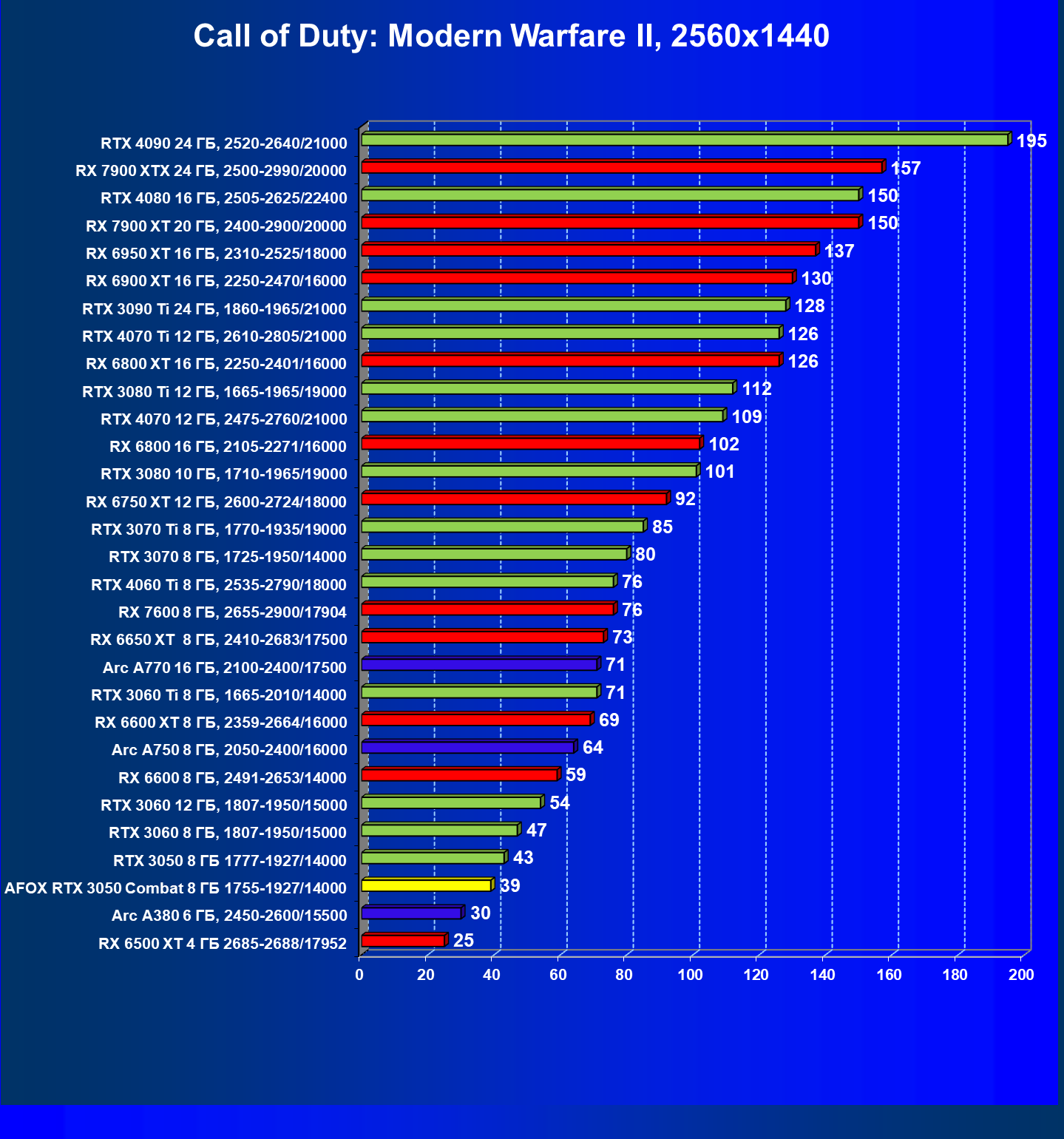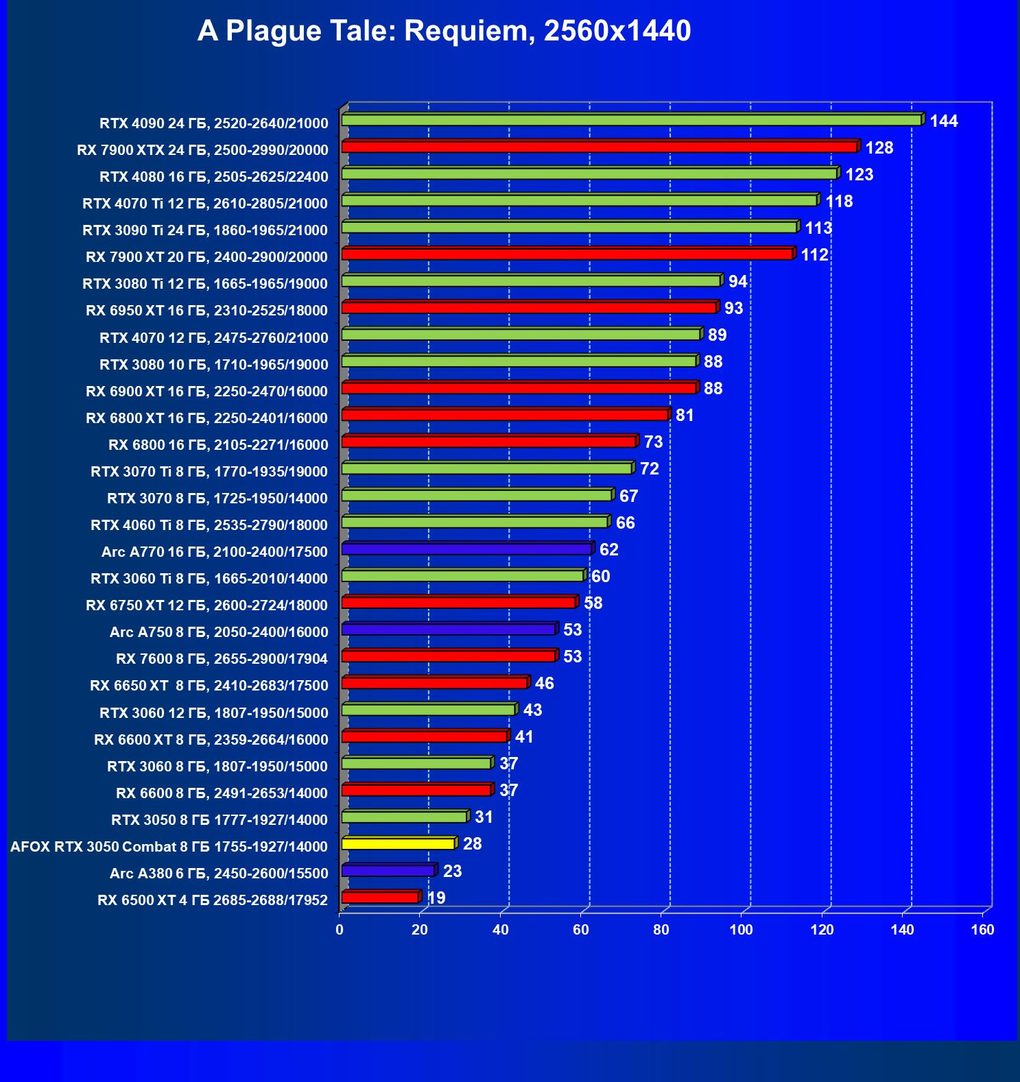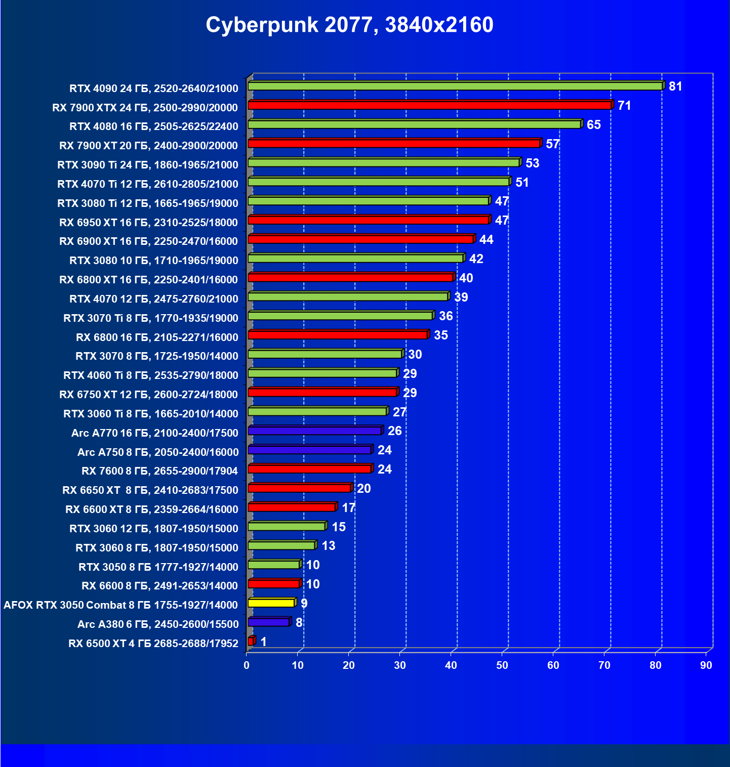 | 14 | Afox RTX 3050 Combat 8 ГБ, 1755—1927/14000 | 81 | 162 | 20 000 |