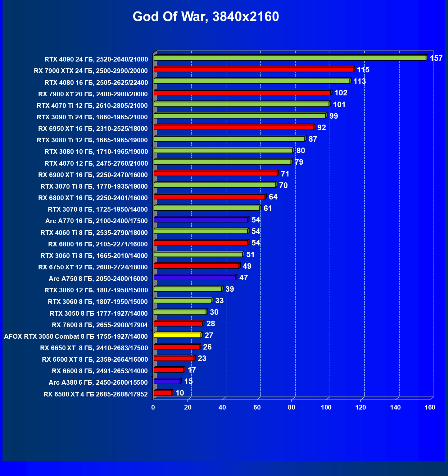 Очевидно, что если обычный GeForce RTX 3050 еще кое-как справляется с играми при максимальном качестве графики в разрешении Full HD, то GeForce RTX 3050 Combat Edition — уже с трудом, в ряде игр придется, вероятно, понижать настройки графики. Его прямой соперник — Intel Arc A380.