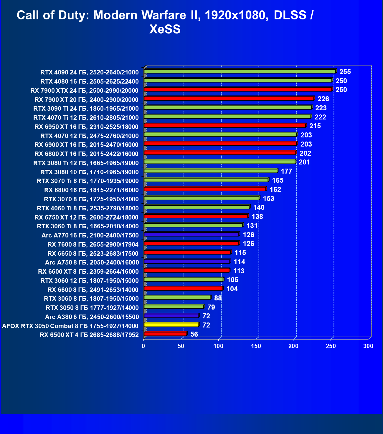 | 14 | Afox RTX 3050 Combat 8 ГБ, 1755—1927/14000 | 111 | 222 | 20 000 |
