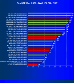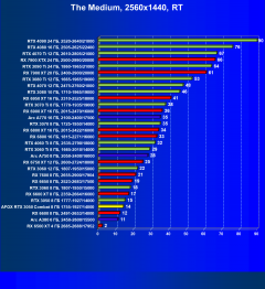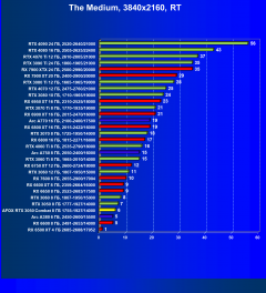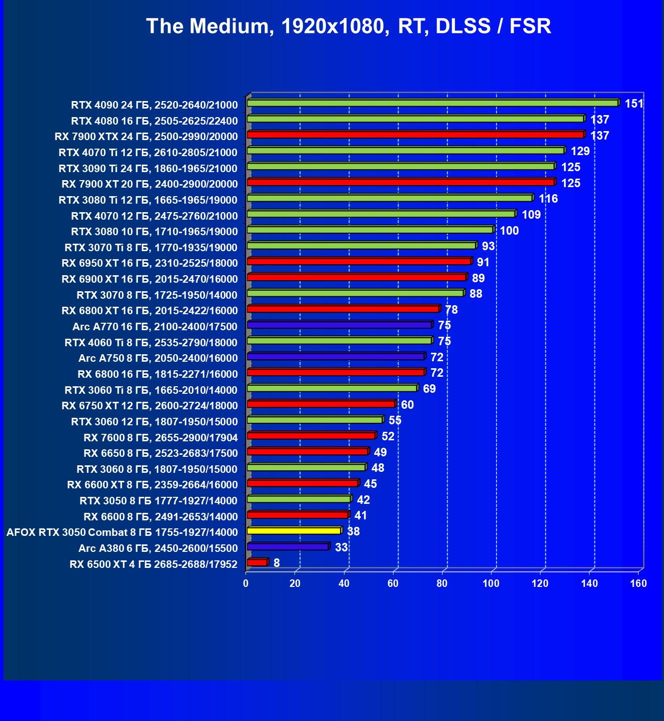 Рейтинг составлен по 9 тестам, в которых используется технология трассировки лучей и одновременно технология Nvidia DLSS, AMD FSR или Intel XeSS. Этот рейтинг нормирован по самому слабому ускорителю в данной группе — Radeon RX 6500 XT (то есть сочетание скорости и функций Radeon RX 6500 XT приняты за 100%).