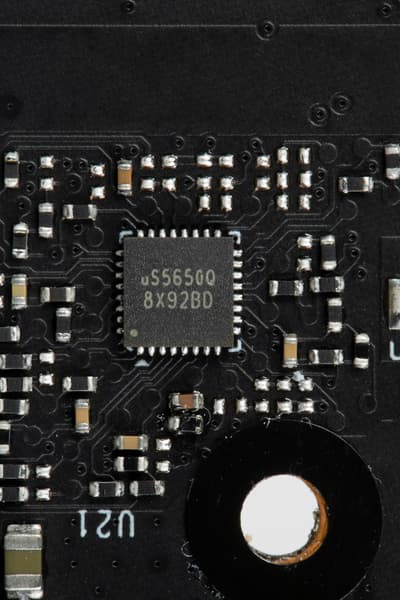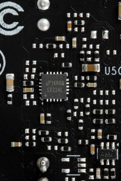 Также имеется контроллер uS5650Q (uPI Semiconductor), отвечающий за мониторинг карты (слежение за напряжением и температурой). Он расположен на лицевой стороне PCB.
