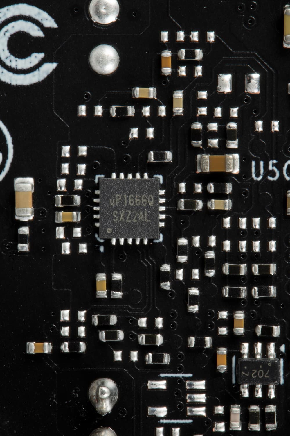 На той же стороне имеется еще один ШИМ-контроллер uP1666Q (uPI), который управляет 1-фазной схемой питания микросхем памяти.