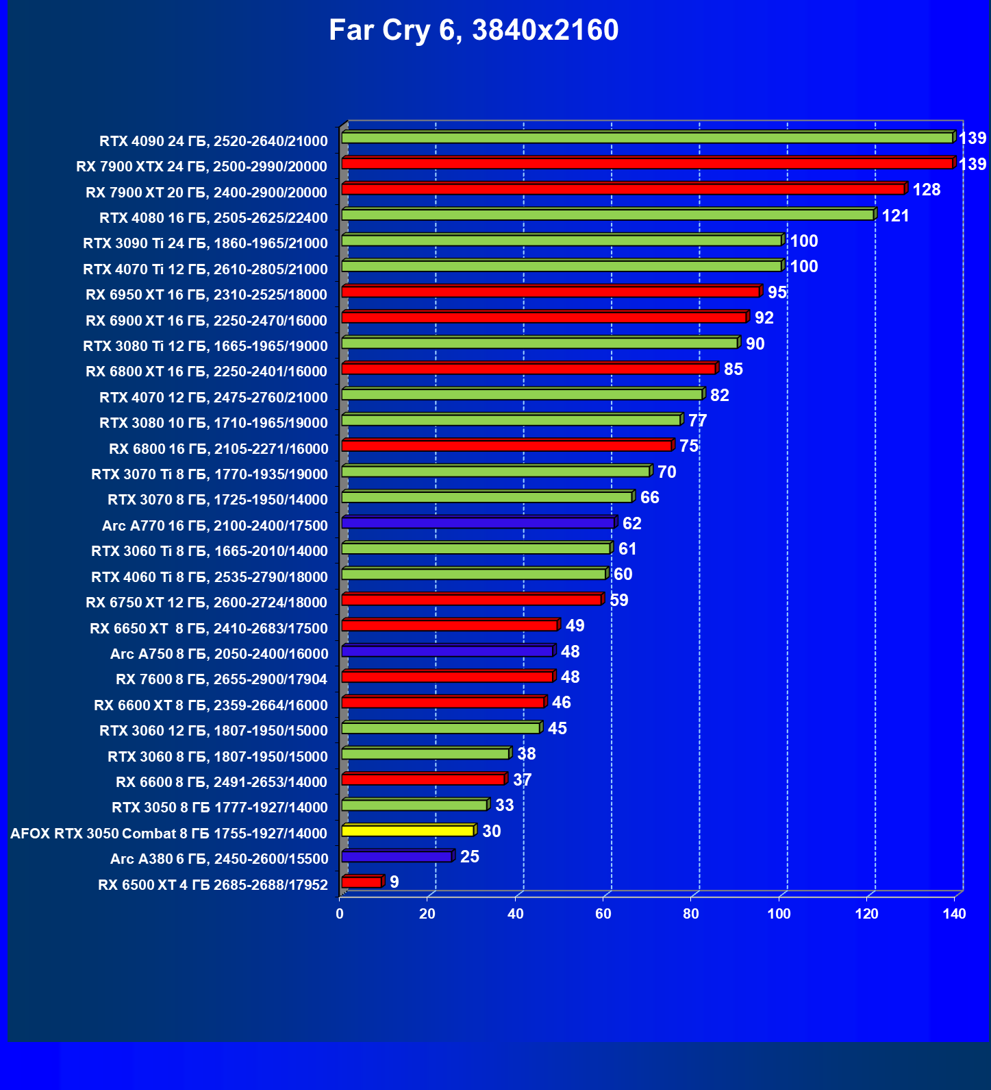 | 29 | Arc A380 6 ГБ, 2450—2600/15500 | 196 | 140 | 14 000 |