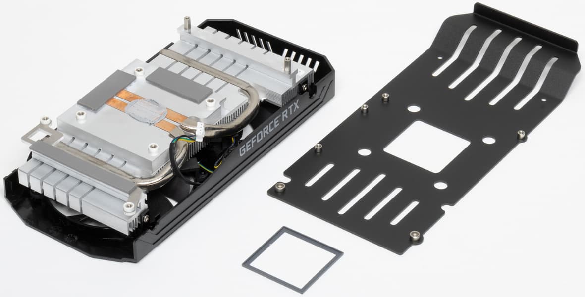 Микросхемы памяти охлаждаются (через термопрокладки) тем же основным радиатором, что и GPU. Для охлаждения преобразователя питания VRM есть отдельная подошва на том же радиаторе. Задняя пластина служит элементом дизайна, защиты PCB и усиливает жесткость платы в целом.