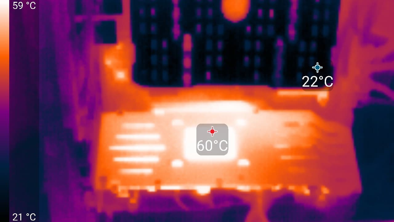 В режиме простоя в 2D и при просмотре видео температура была не выше 26,8 °C, вентиляторы вращались на скорости 810 оборотов в минуту, уровень шума остался на уровне фонового — 18 дБА.