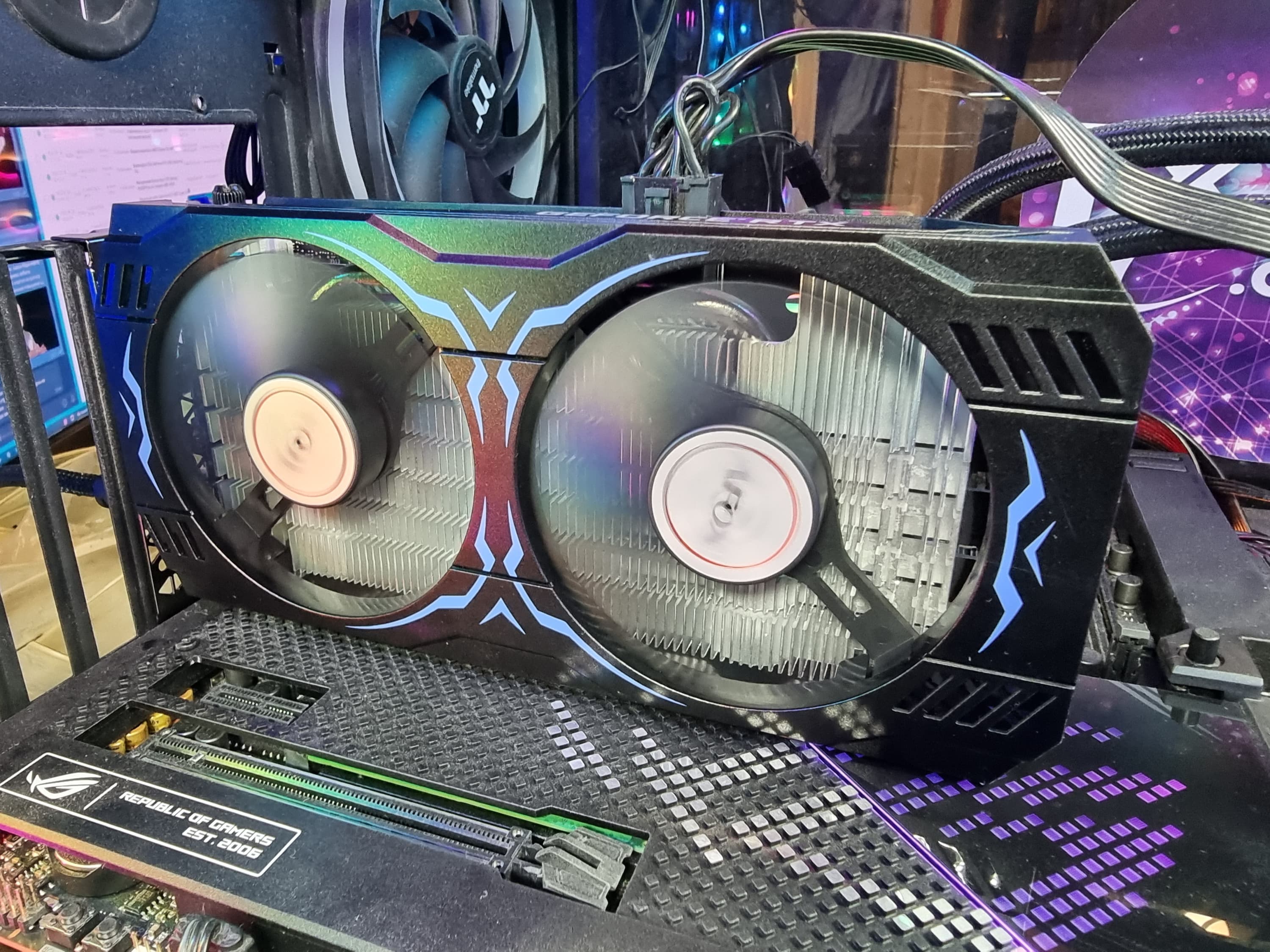 Карта оснащена двумя большими 90-миллиметровыми вентиляторами для эффективного охлаждения. Фирменные вентиляторы «Крыло» имеют 11 лопастей аэродинамичной формы для наиболее эффективного распределения и направления воздушных потоков.