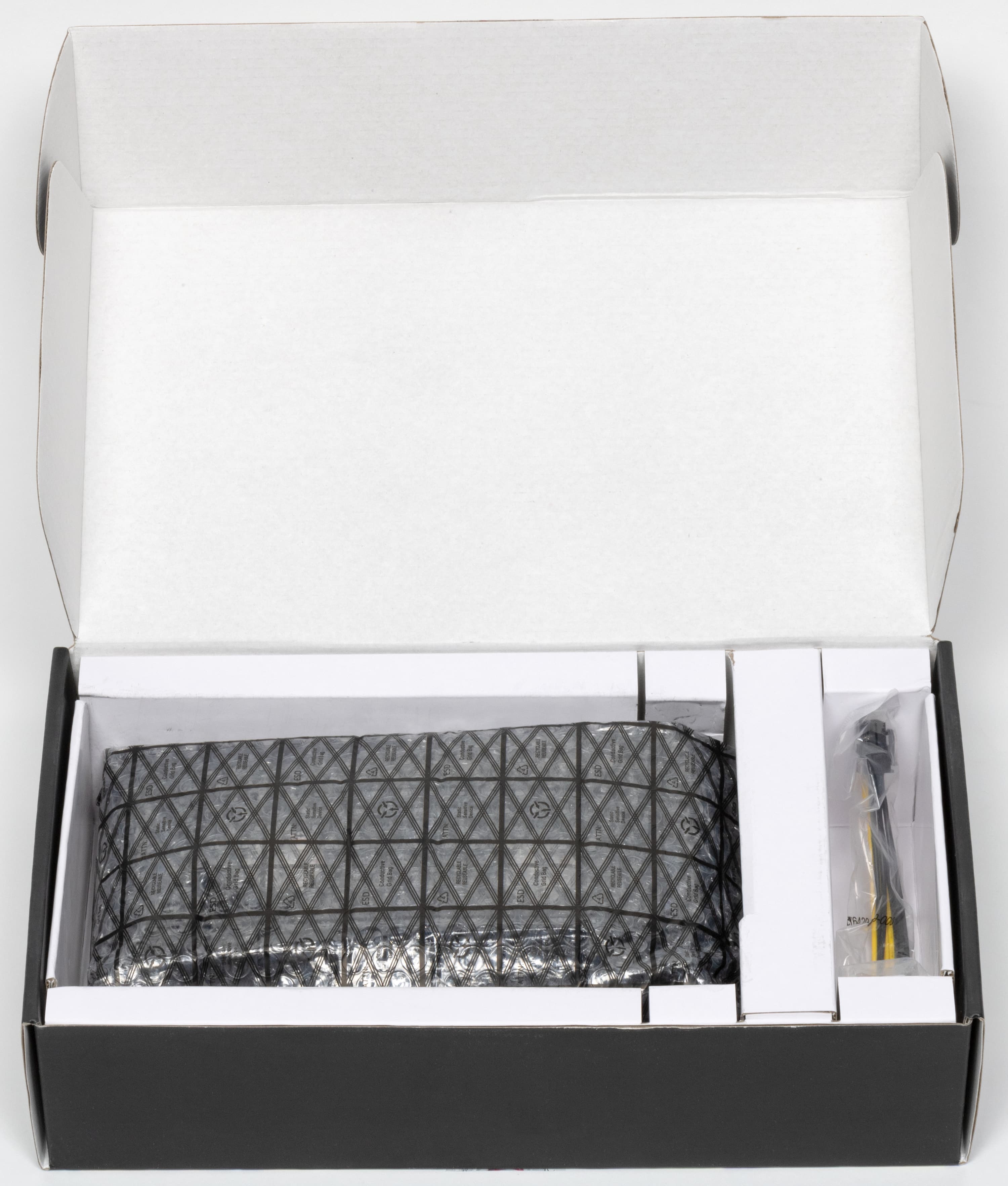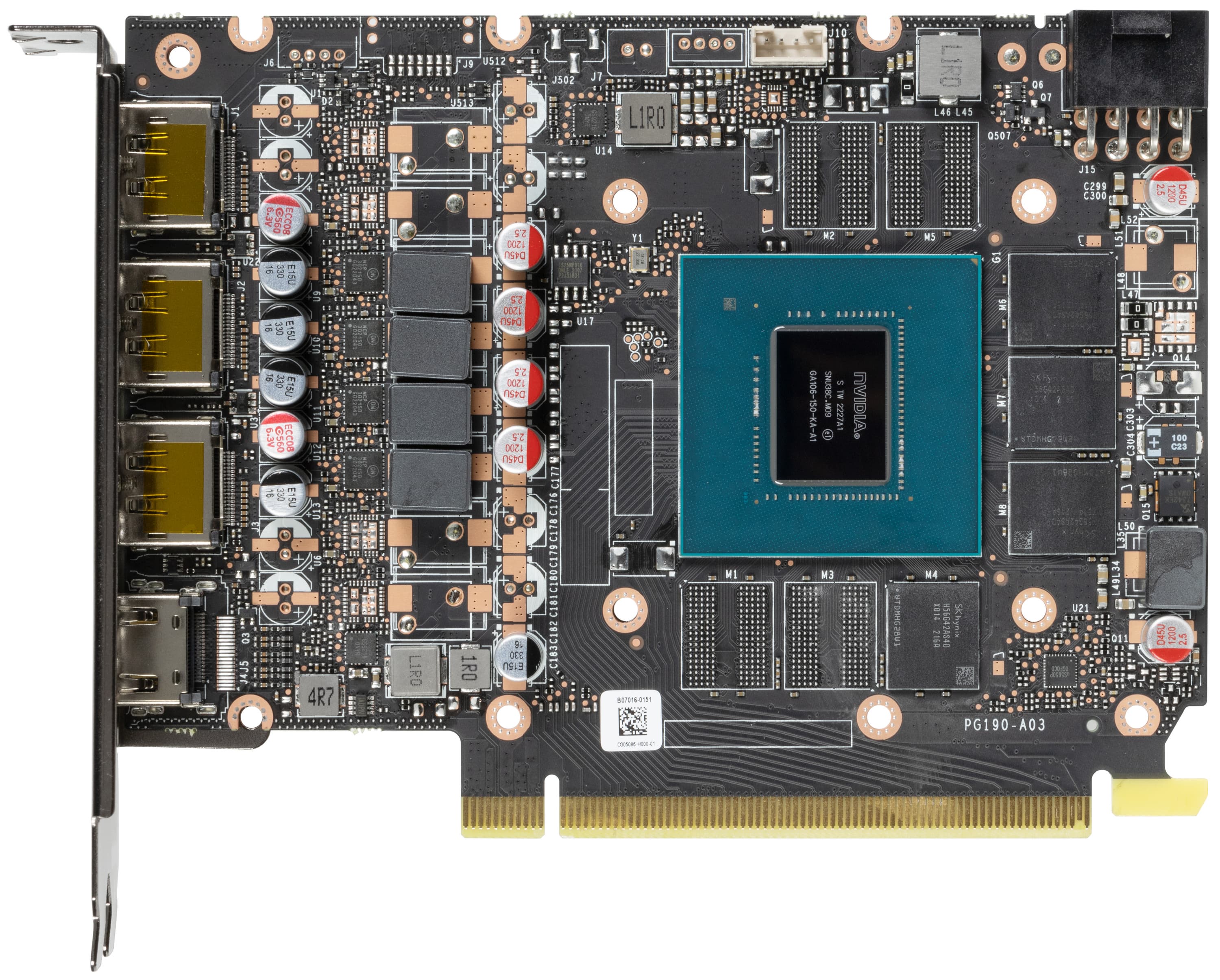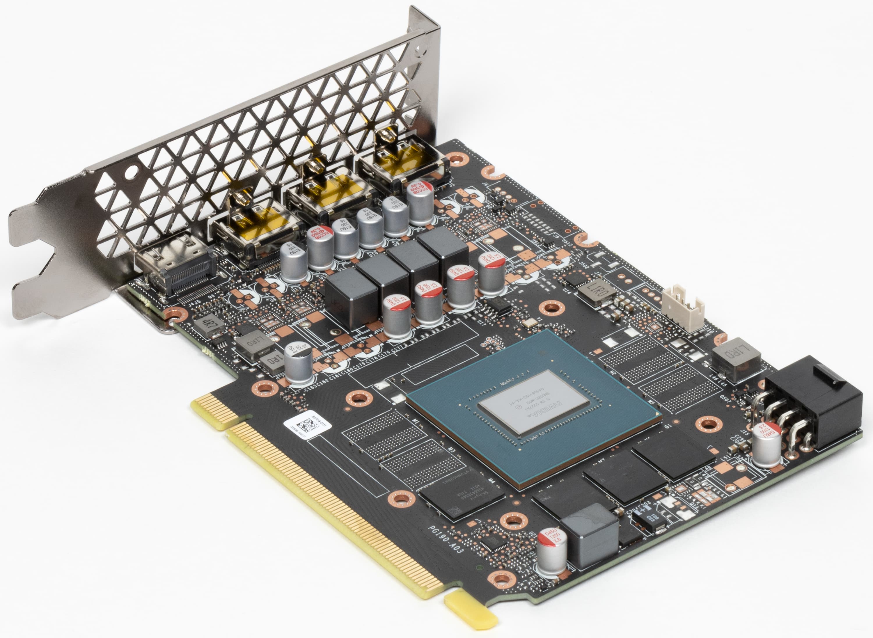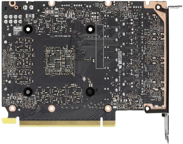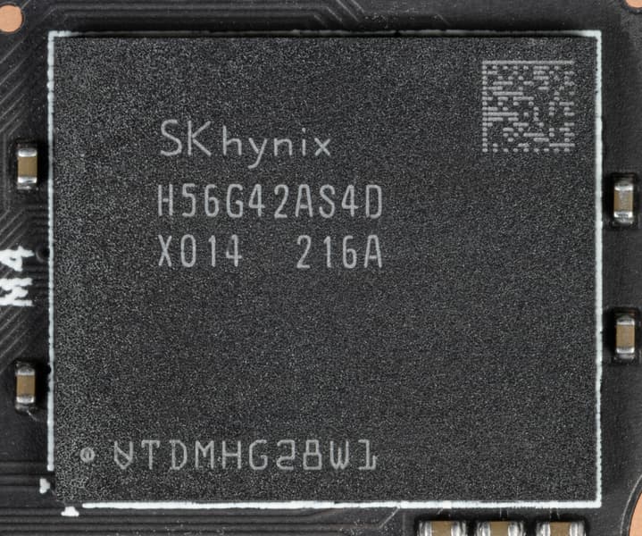 Карта имеет 8 ГБ памяти GDDR6 SDRAM, размещенной в 4 микросхемах по 16 Гбит на лицевой стороне PCB. Микросхемы памяти SK hynix (GDDR6) рассчитаны на условную номинальную частоту работы в 3500 (14000) МГц.
