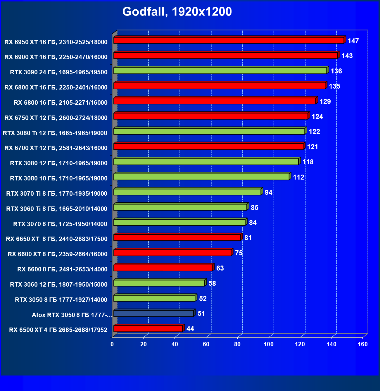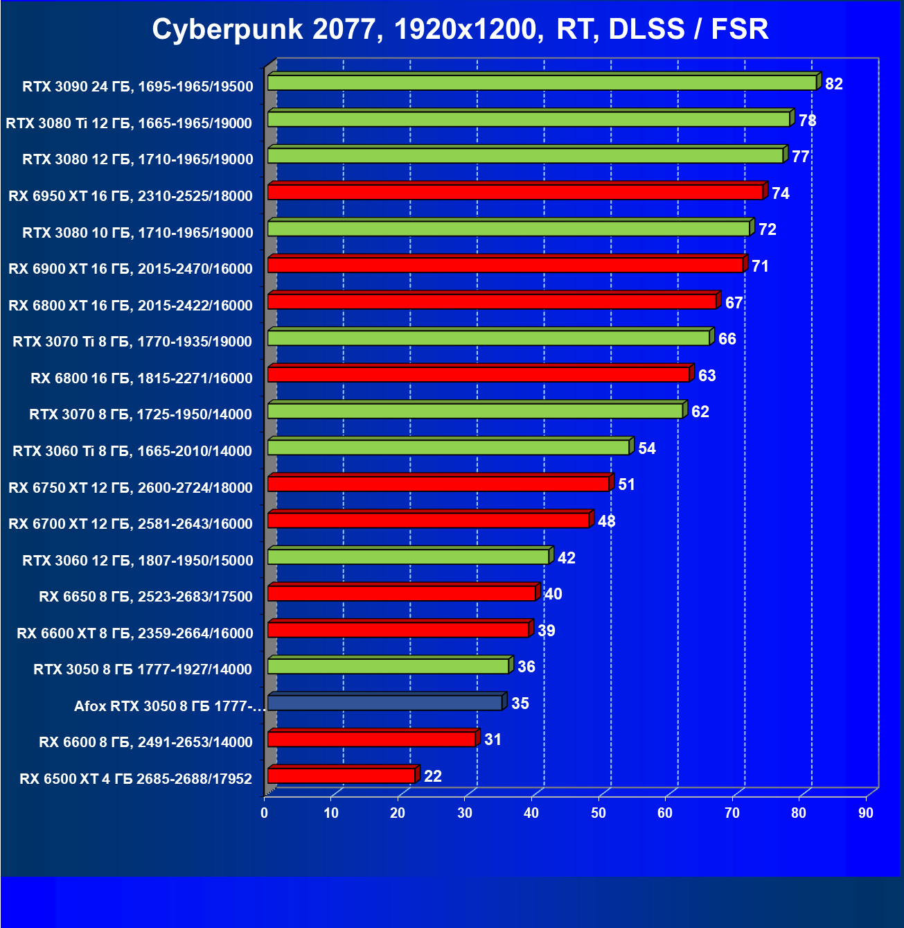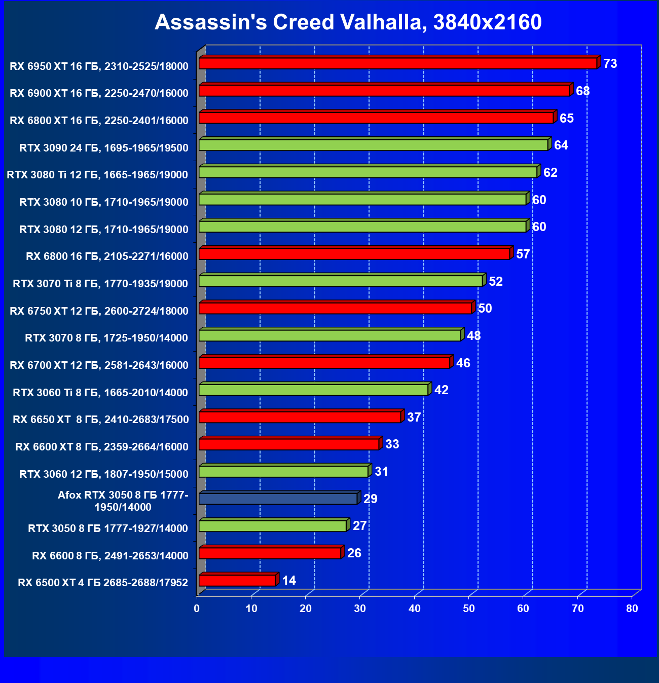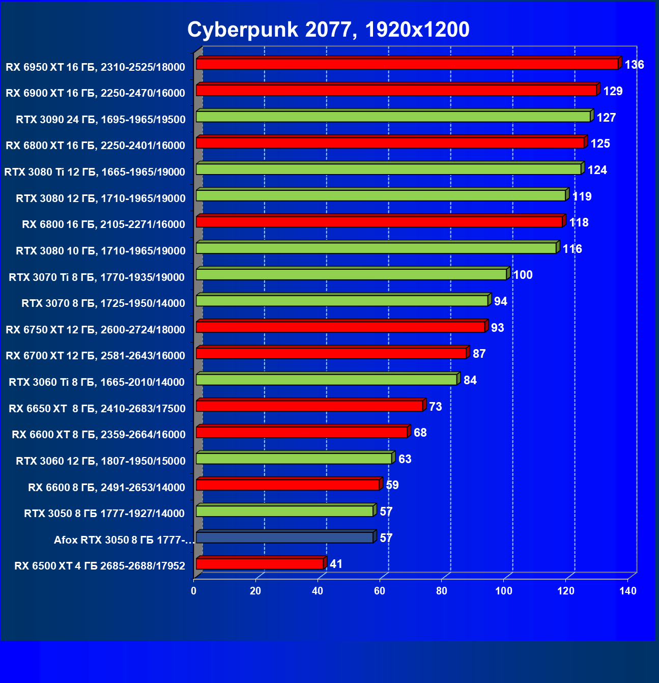 | 18 | Afox GeForce RTX 3050 D6H2 (8 ГБ), 1777—1950/14000 | 164 | 75 | 22 000 |