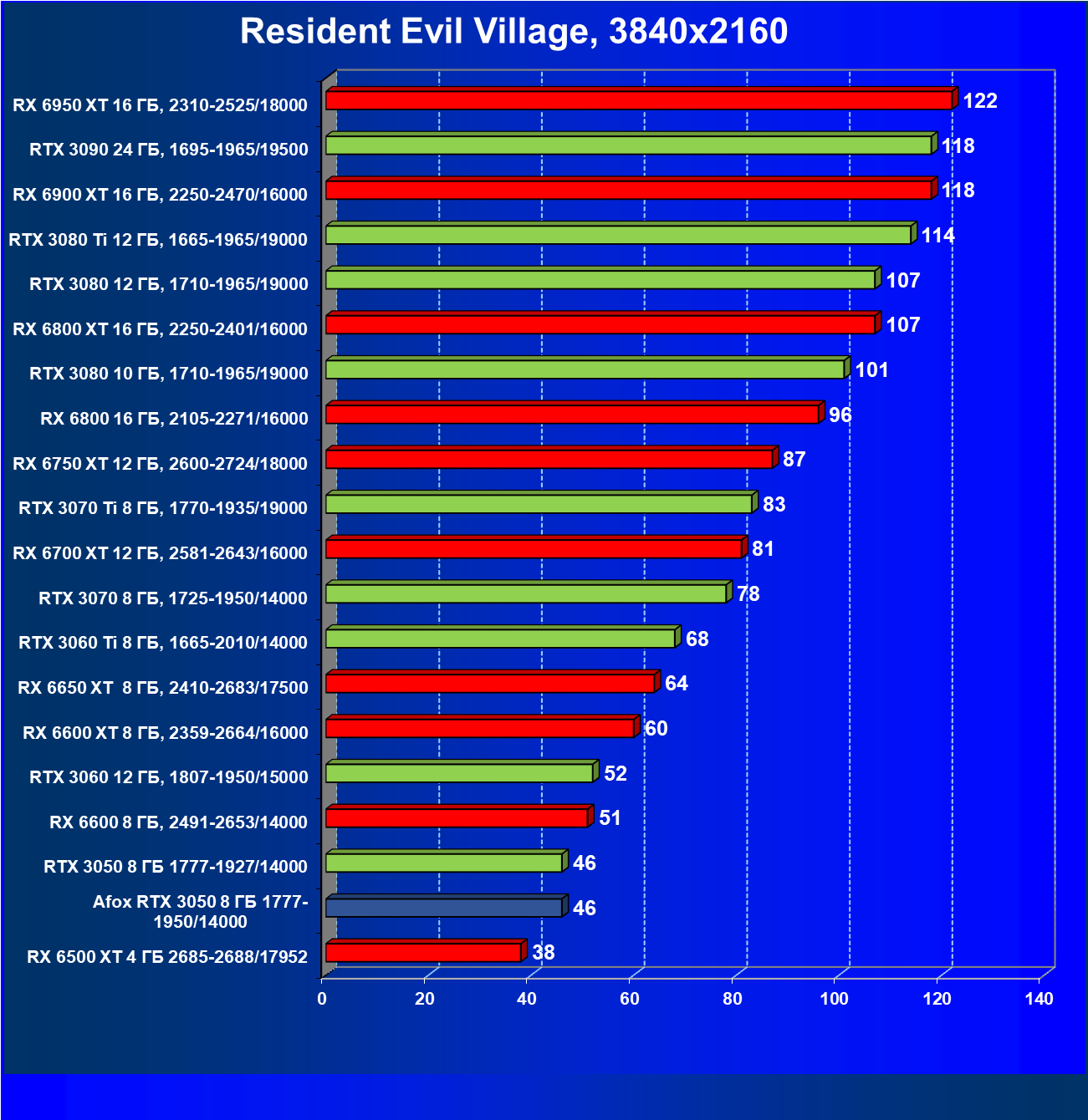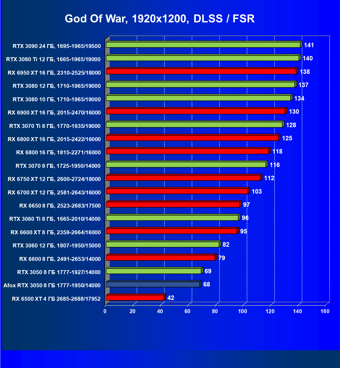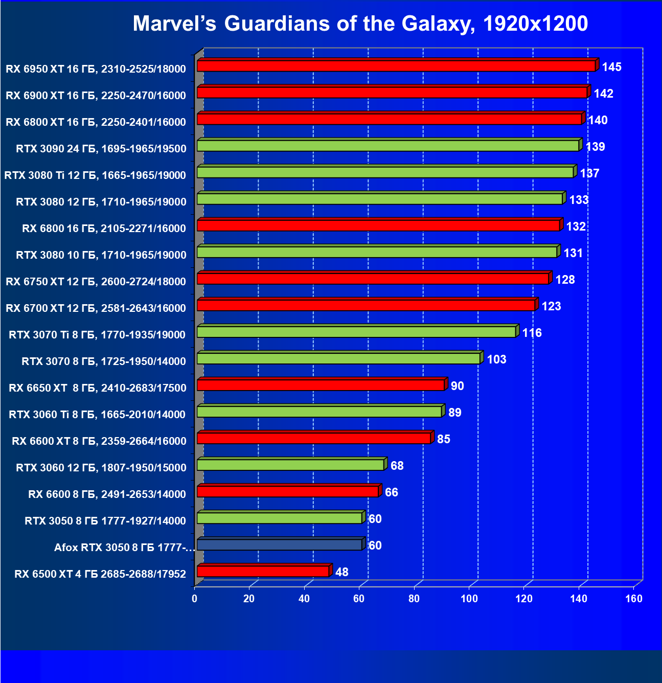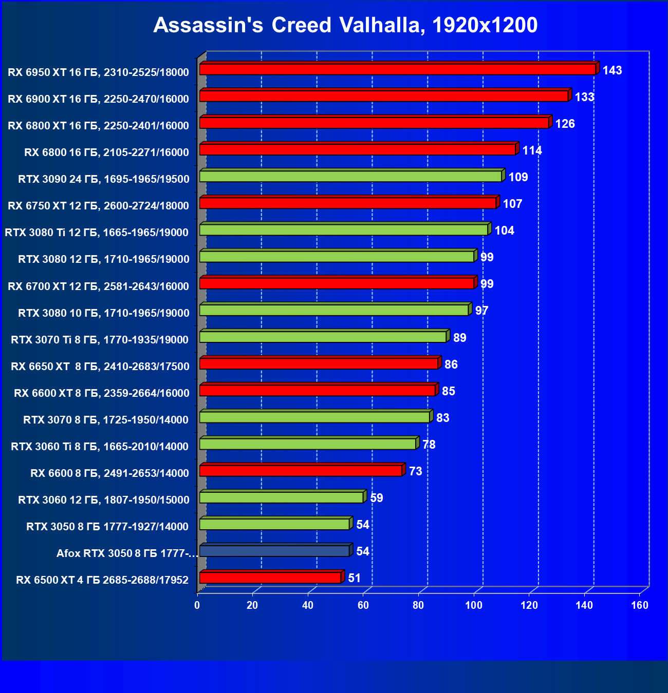 | 18 | Afox GeForce RTX 3050 D6H2 (8 ГБ), 1777—1950/14000 | 164 | 75 | 22 000 |