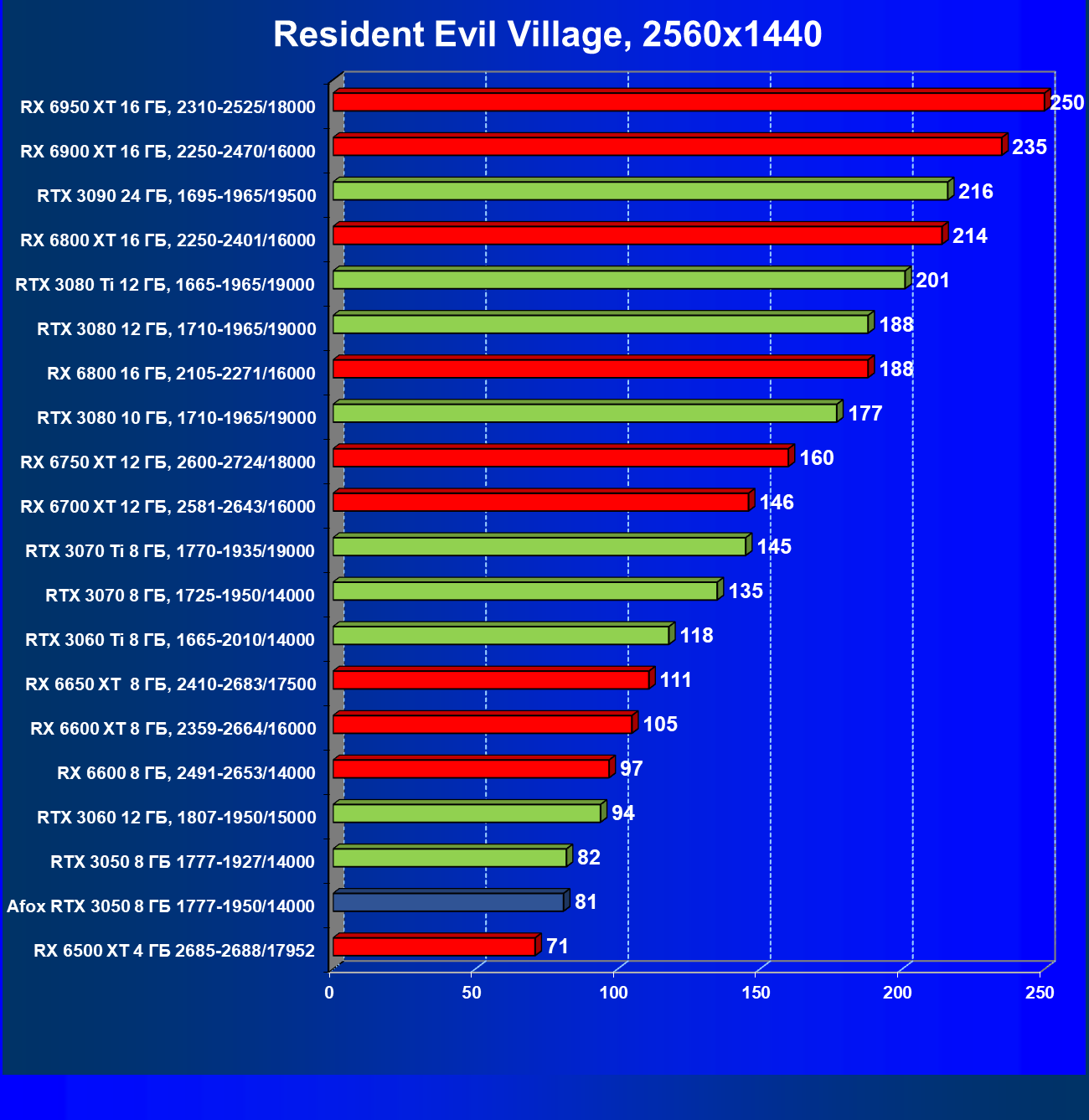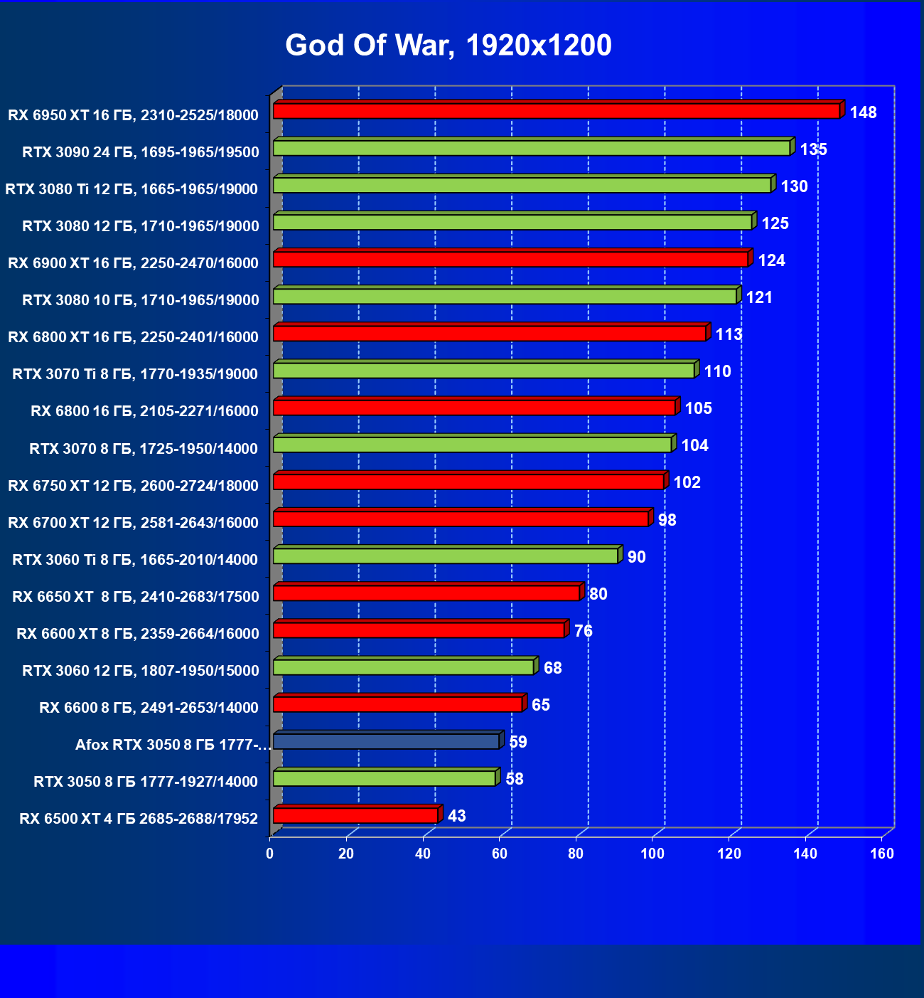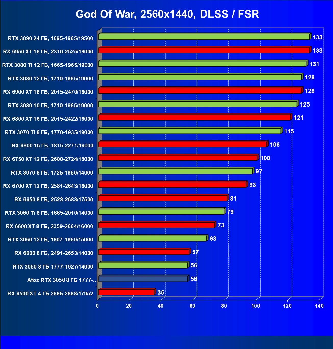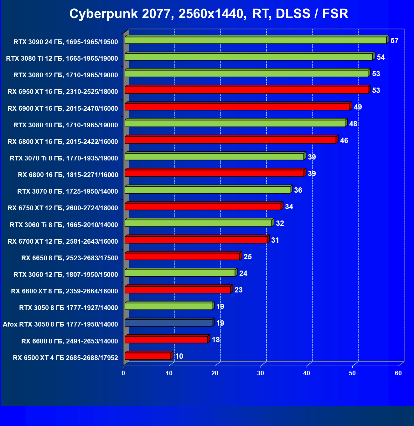 | 18 | Afox GeForce RTX 3050 D6H2 (8 ГБ), 1777—1950/14000 | 164 | 75 | 22 000 |