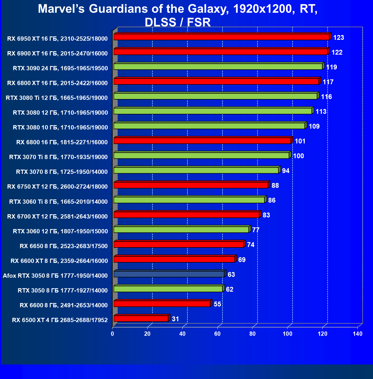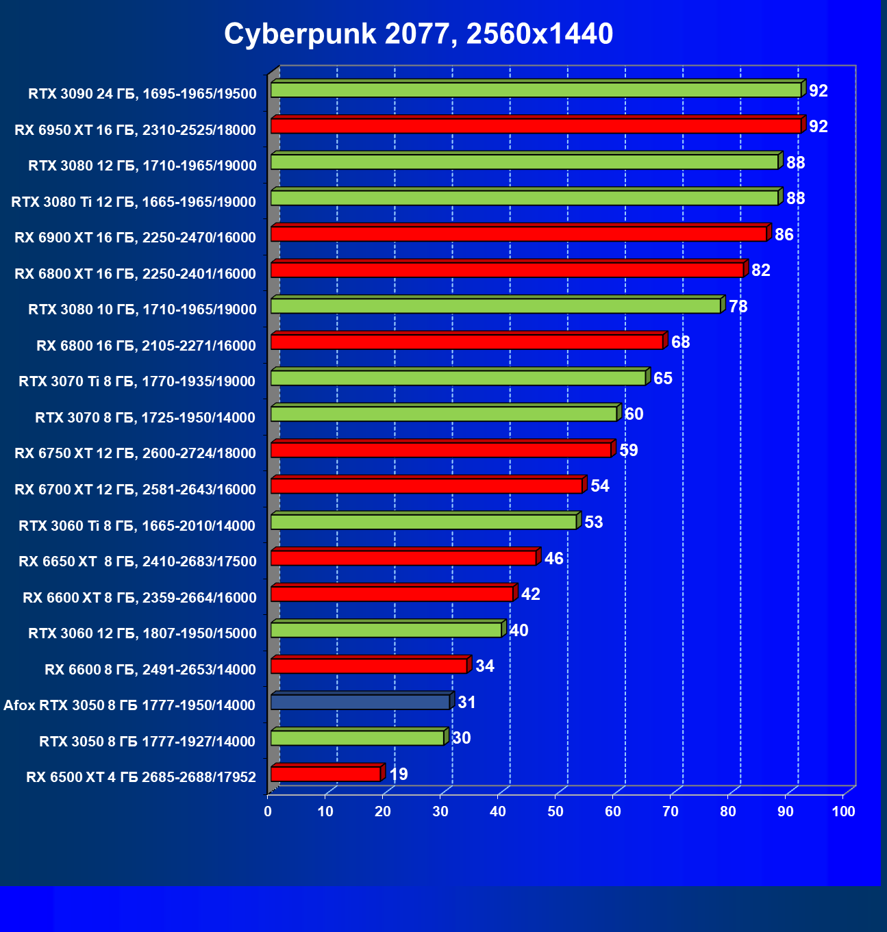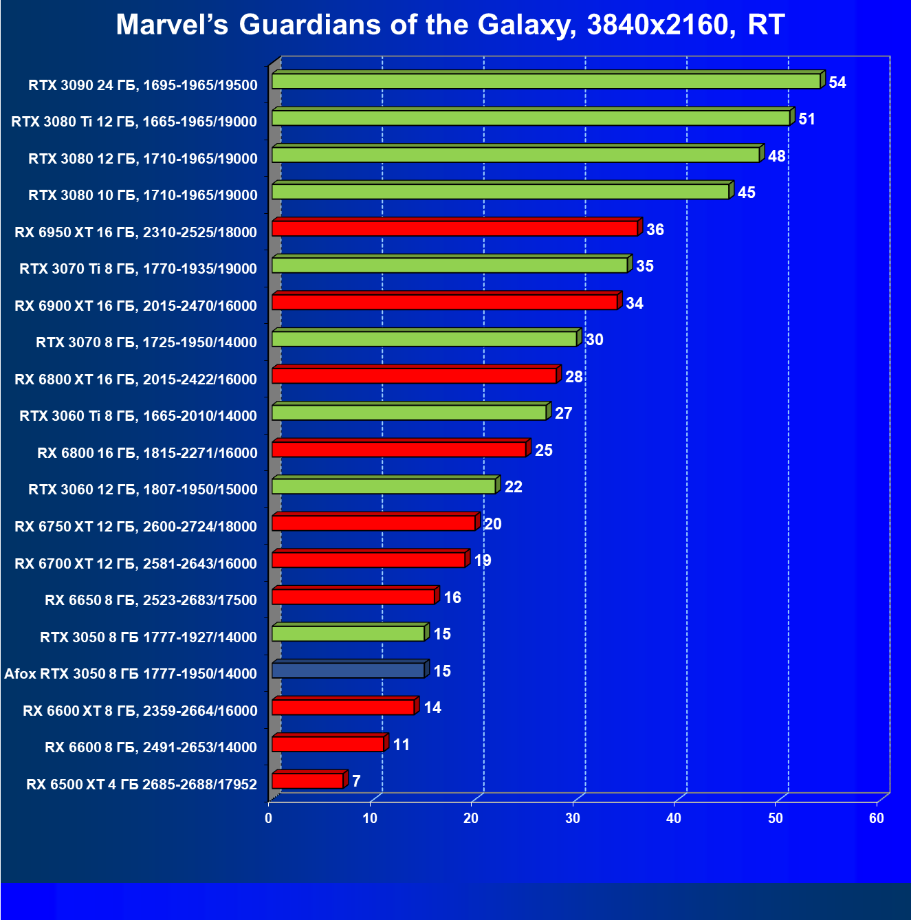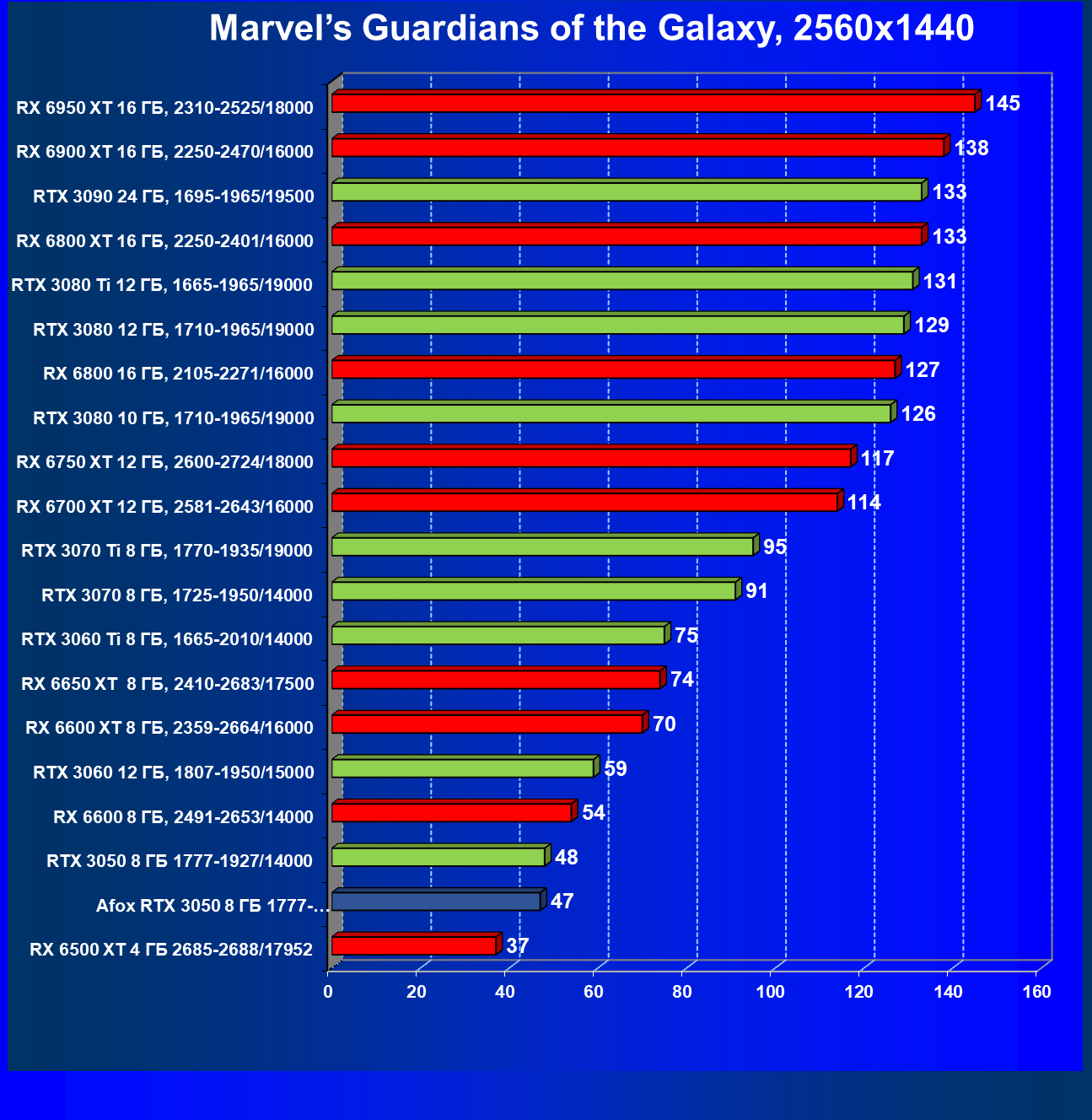 | 18 | Afox GeForce RTX 3050 D6H2 (8 ГБ), 1777—1950/14000 | 164 | 75 | 22 000 |