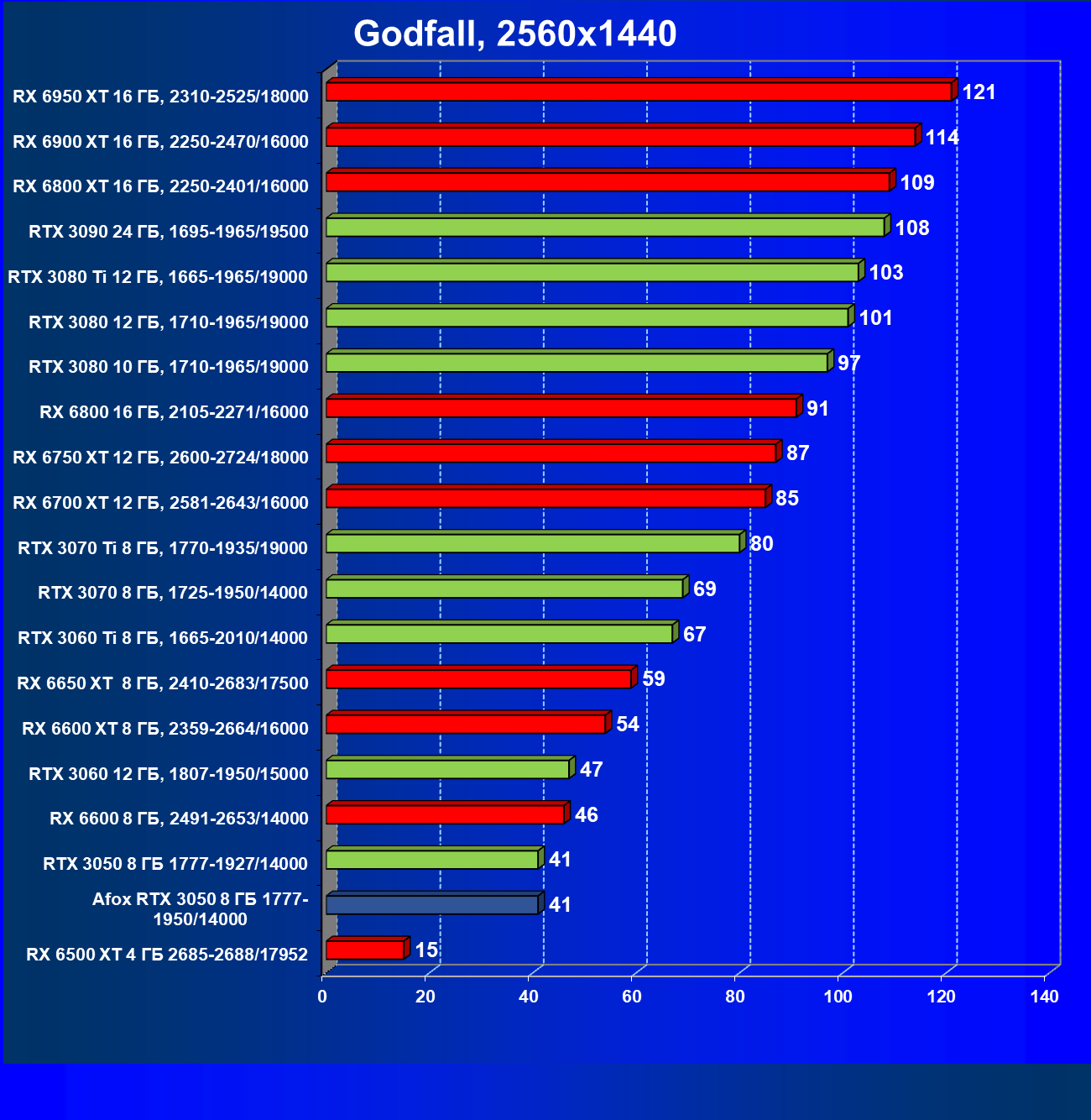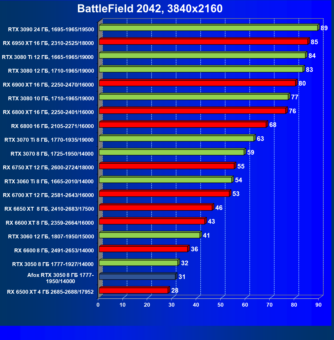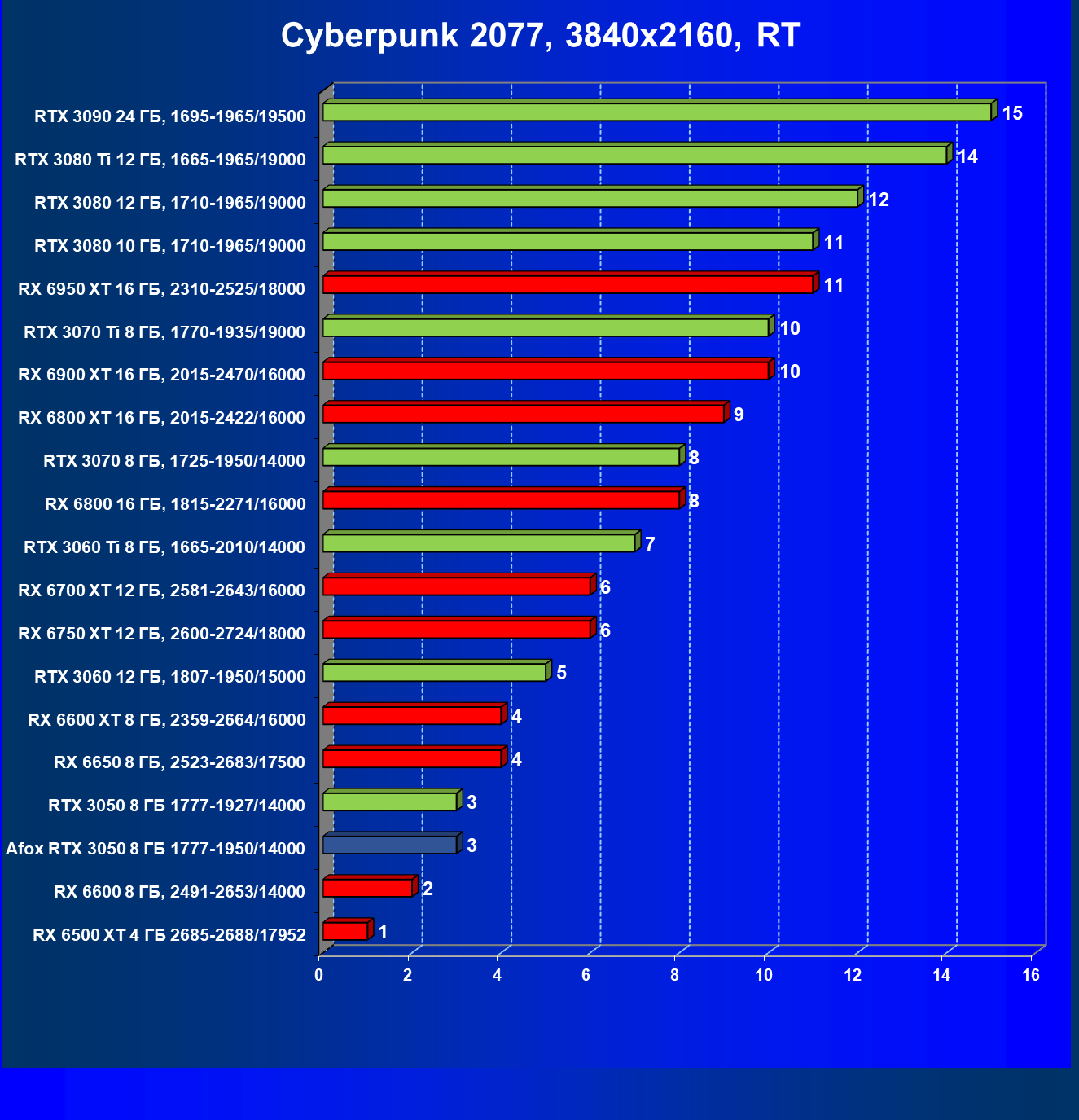 | 11 | RX 6600 XT 8 ГБ, 2359—2664/16000 | 89 | 321 | 36 000 |