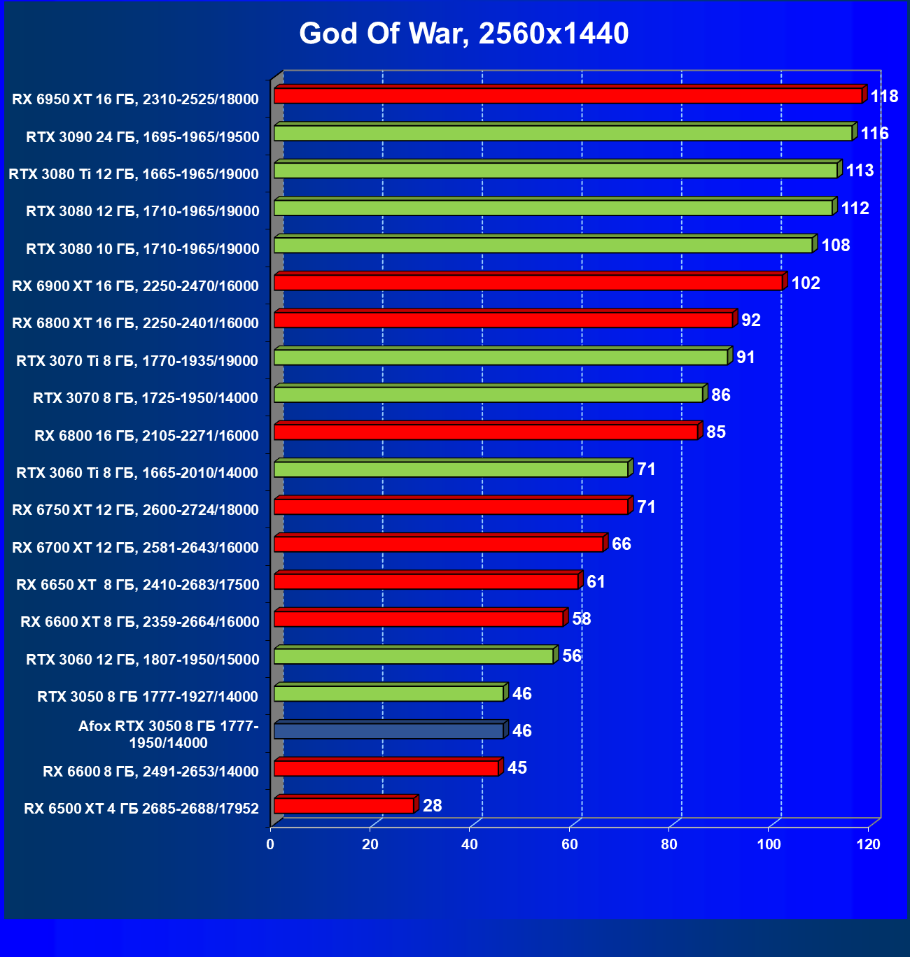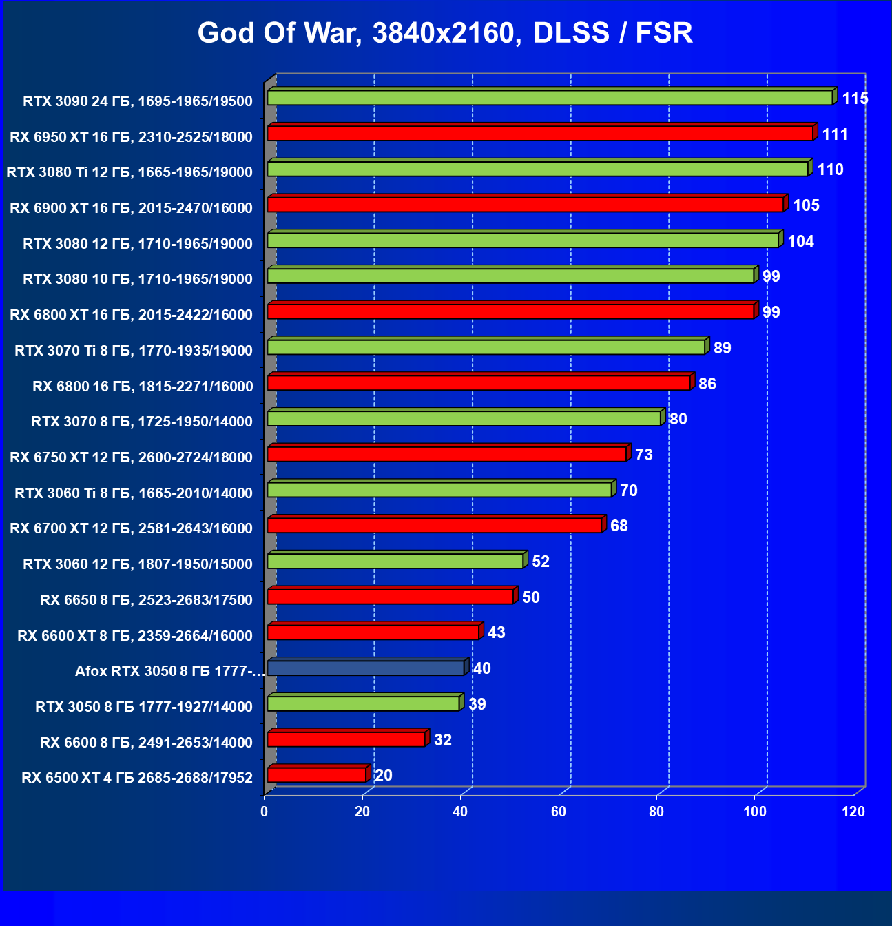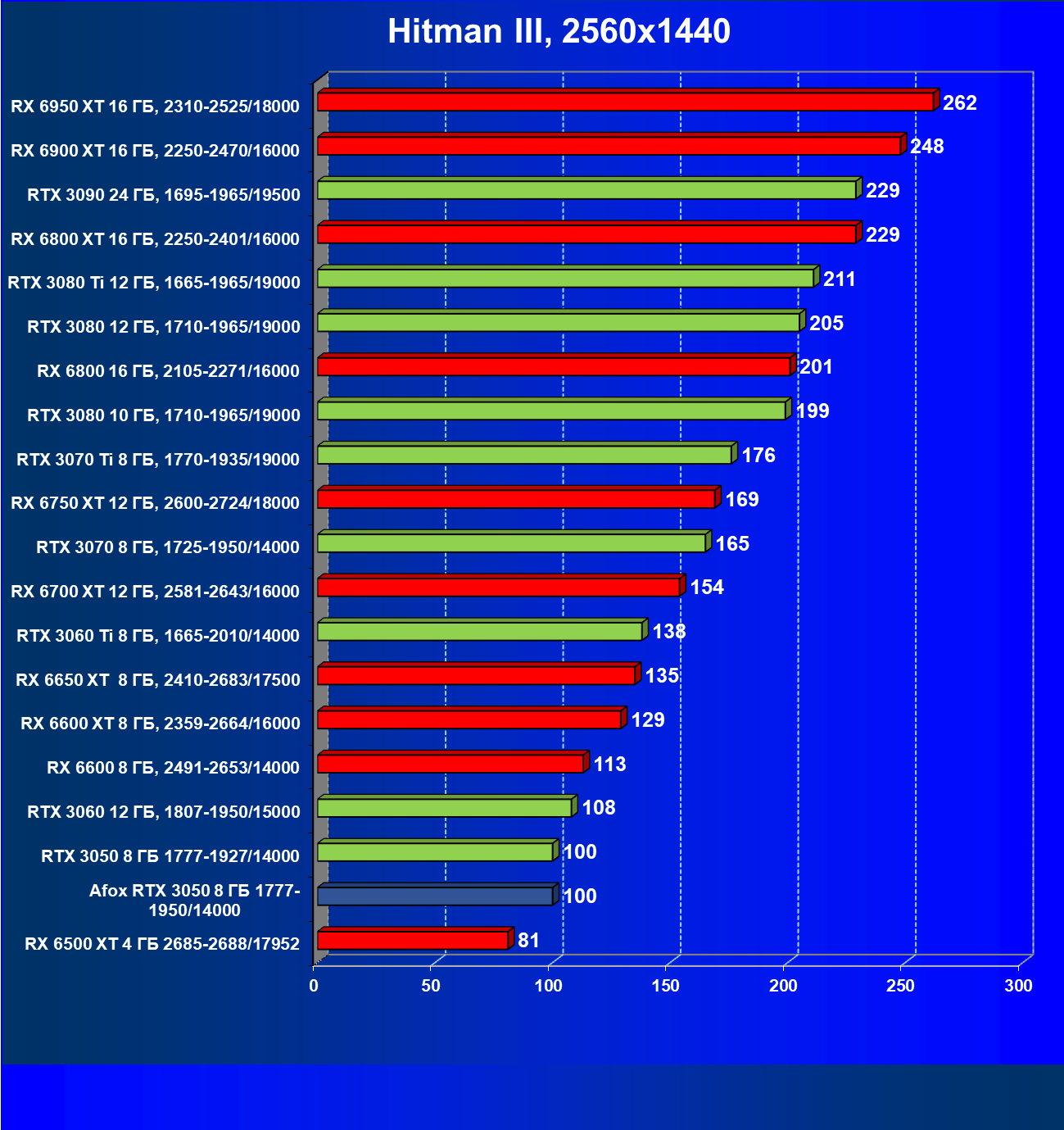 | 01 | Afox GeForce RTX 3050 D6H2 (8 ГБ), 1777—1950/14000 | 115 | 254 | 22 000 |