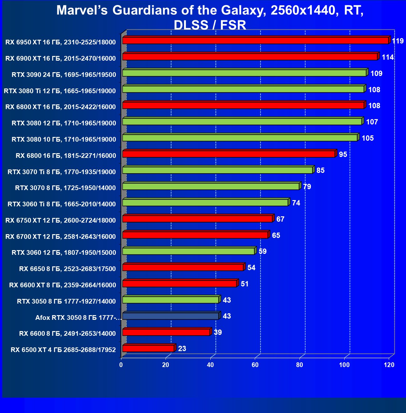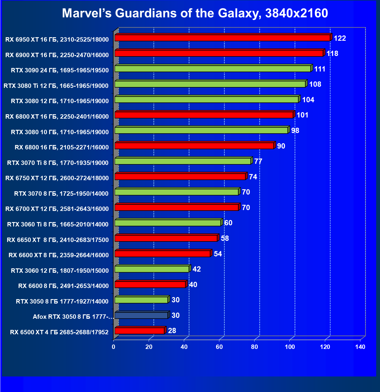 | 17 | RX 6600 8 ГБ, 2491—2653/14000 | 182 | 65 | 28 000 |
