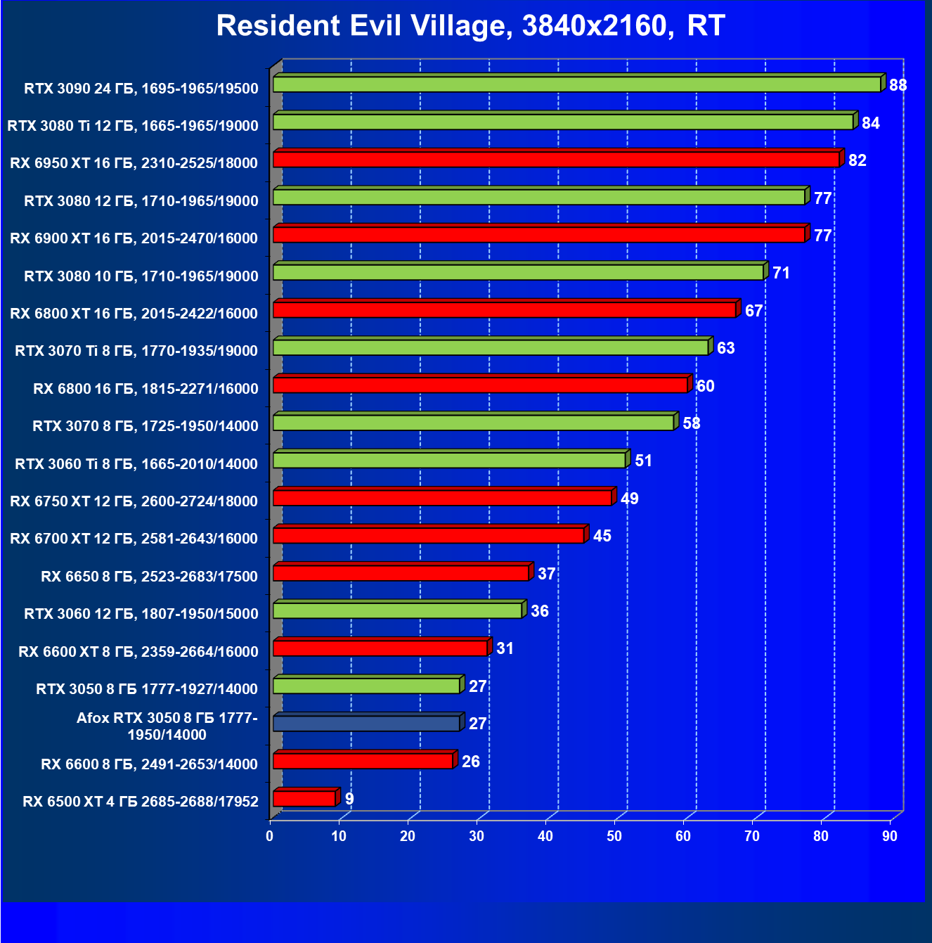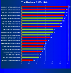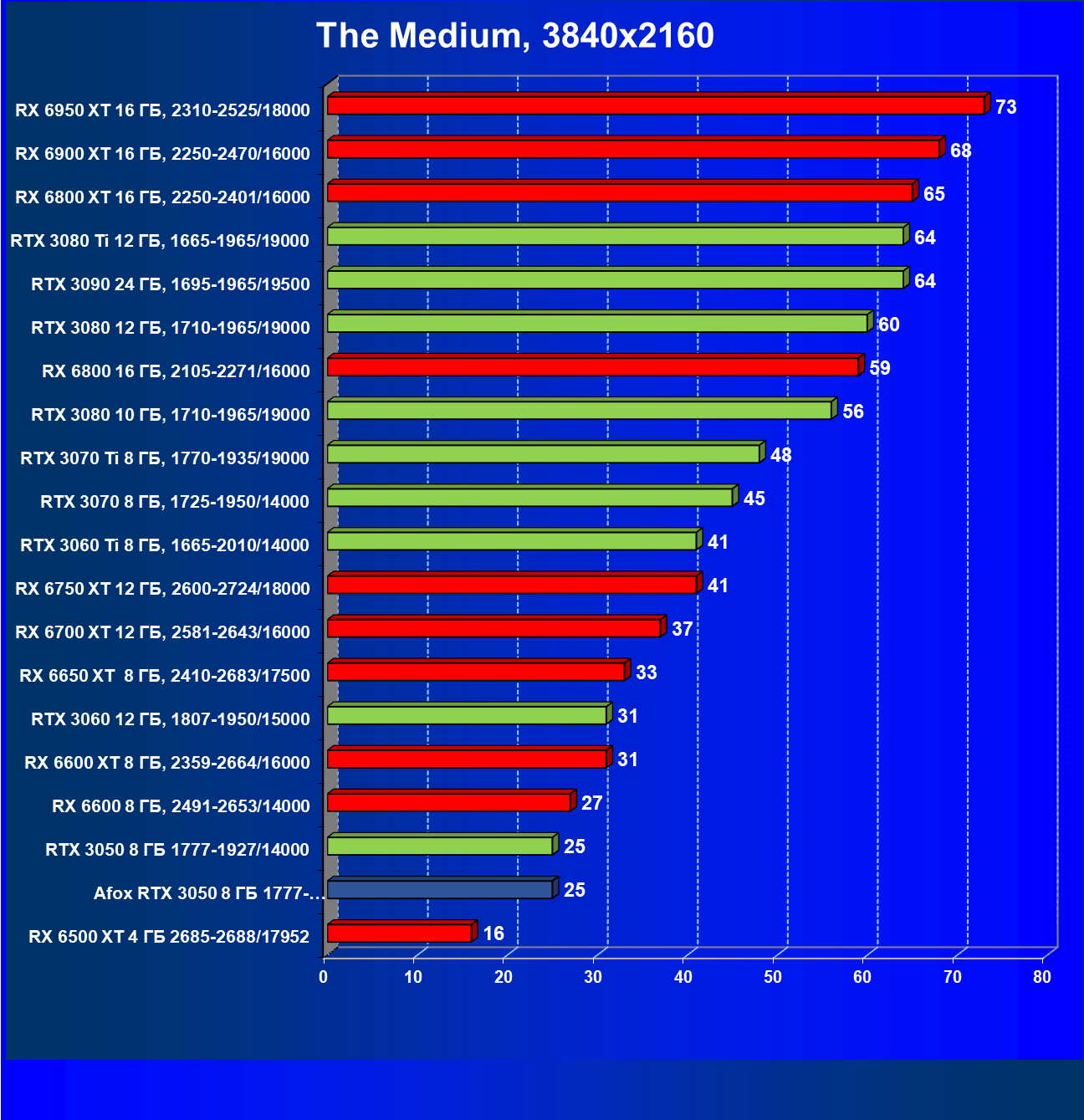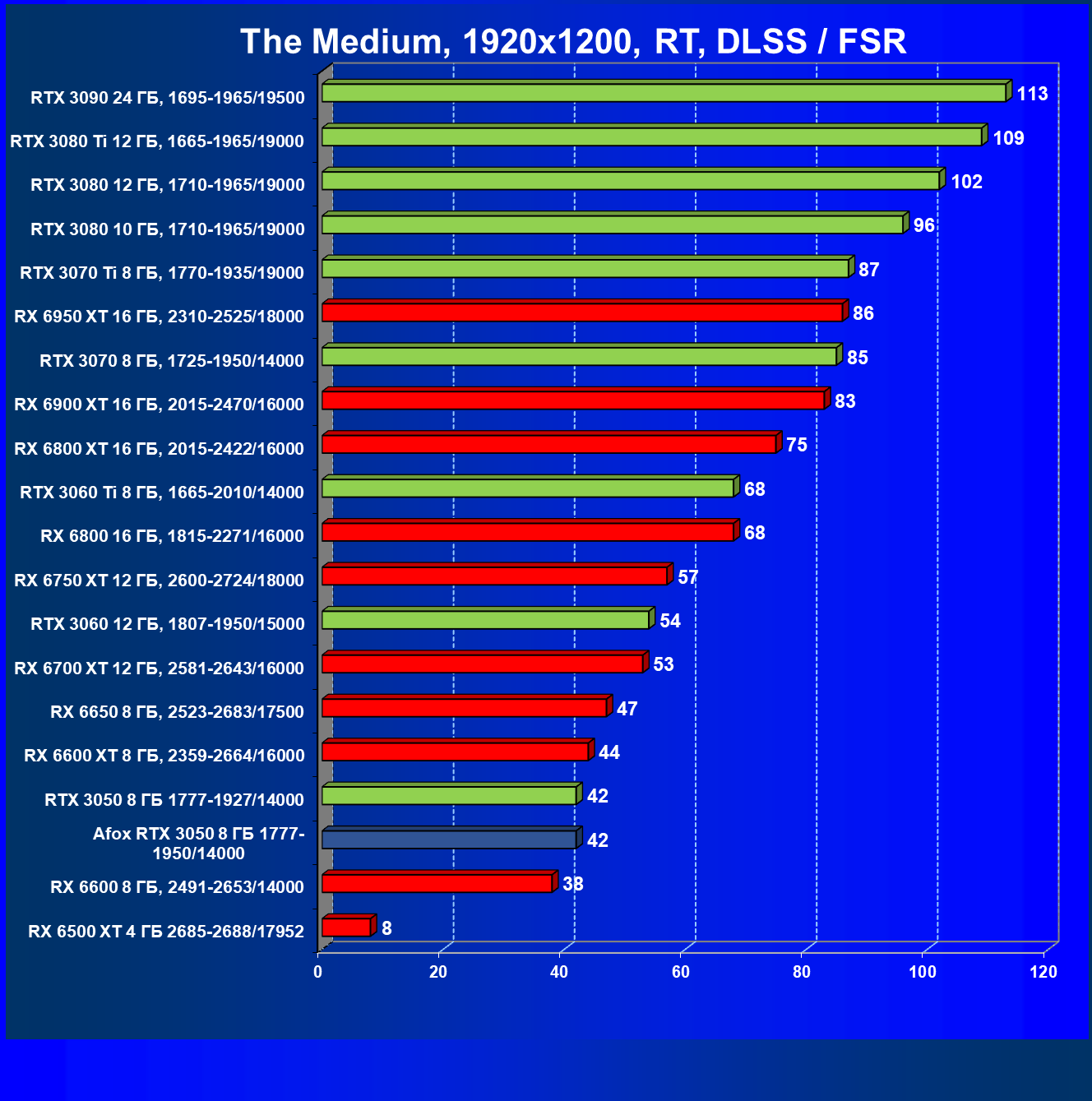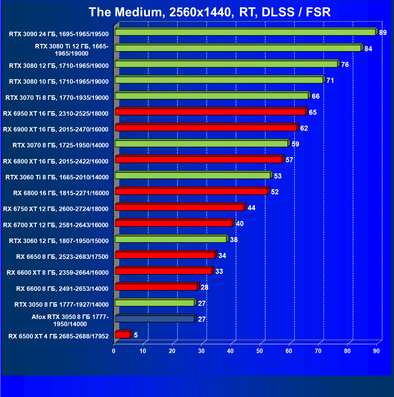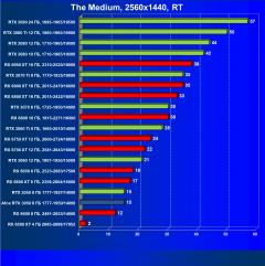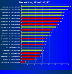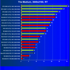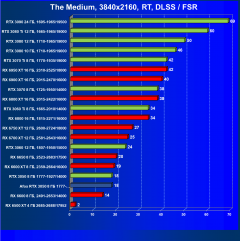 Рейтинг составлен по 9 тестам с применением технологии трассировки лучей (с Nvidia DLSS и с AMD FSR в играх God of War, The Medium и Far Cry 6).