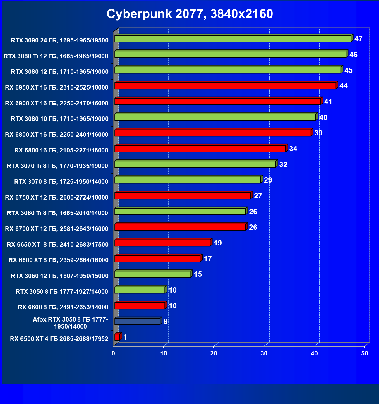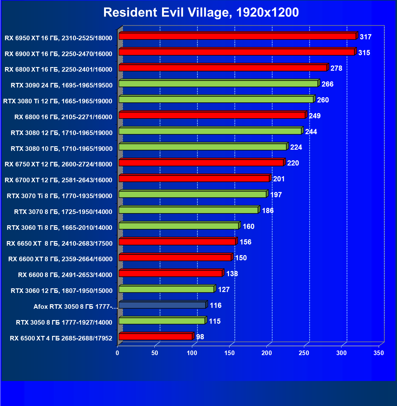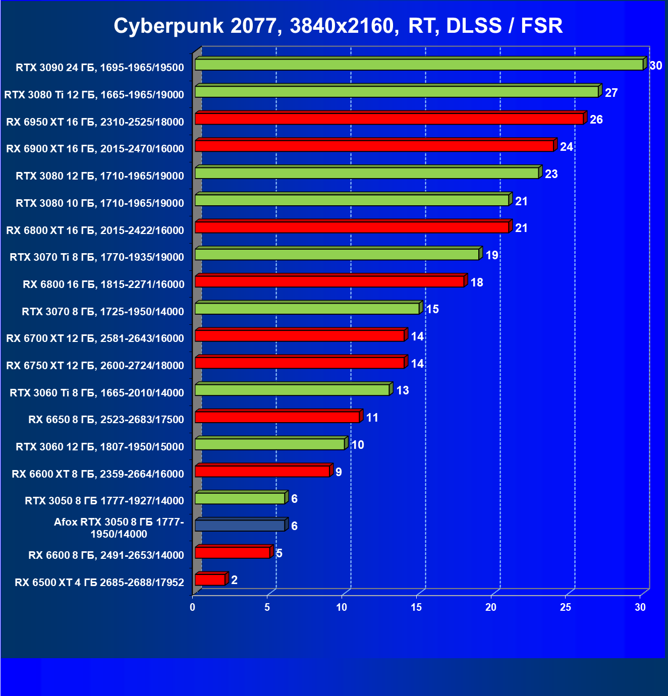 | 01 | Afox GeForce RTX 3050 D6H2 (8 ГБ), 1777—1950/14000 | 75 | 164 | 22 000 |