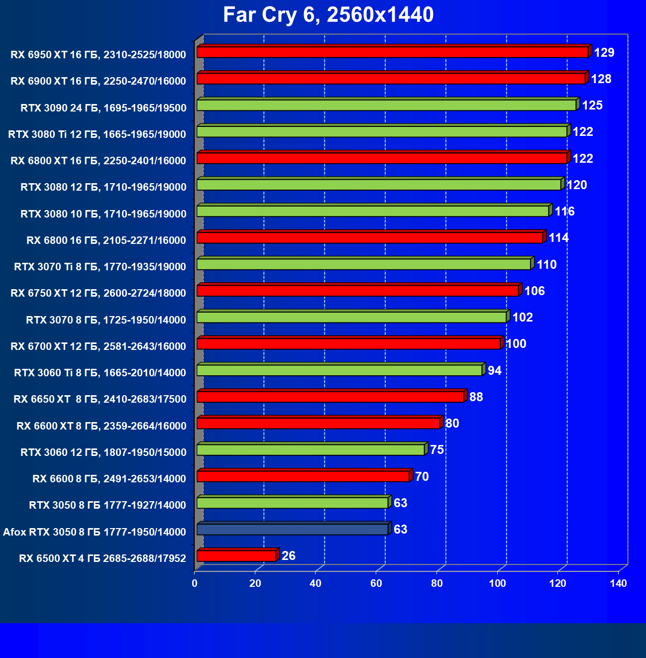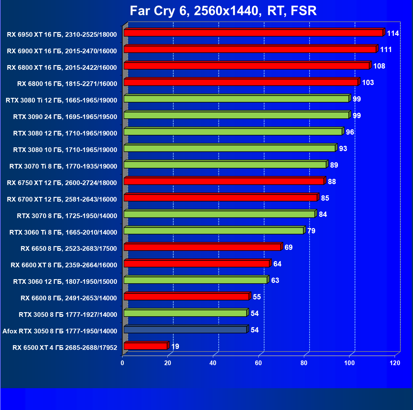 | 20 | RX 6500 XT 4 ГБ, 2685—2688/17952 | 100 | 56 | 18 000 |