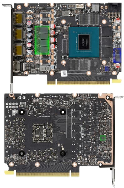 Зеленым отмечены фазы питания и ШИМ-контроллер в схеме питания графического процессора, а синим — фазы питания и ШИМ-контроллер для снабжения микросхем памяти.