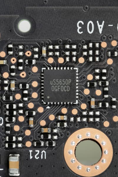На лицевой стороне имеется ШИМ-контроллер uS5650P (uPI Semiconductor), который управляет однофазной схемой питания четырех микросхем памяти. Он же отвечает и за мониторинг.