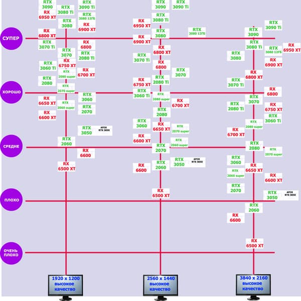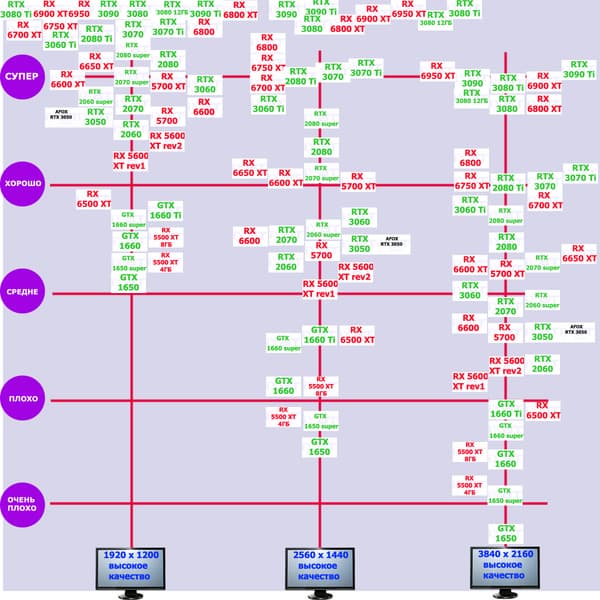 Для пользователей которые нуждаются в прямом ответе, а именно в каком разрешении карта справляется по своей производительности и кто с ней конкурирует, вначале всех обзоров серийных видеокарт мы обновляем свои знания о производительности семейства, к которому относится ускоритель, и его соперников. Все это нами субъективно оценивается по шкале из пяти градаций.