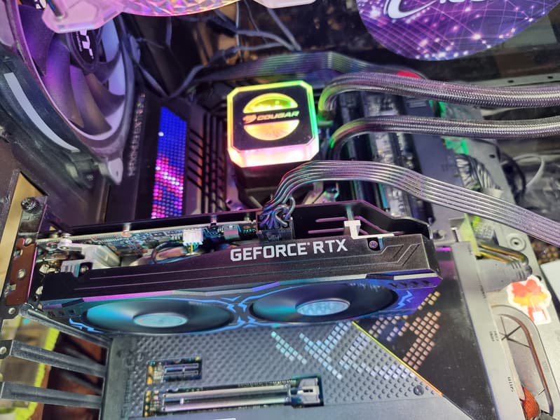 GeForce RTX 3050 — один из самых выгодных ускорителей на сегодня с учетом цен. Объем памяти у него достаточный для современных игр с технологиями трассировки лучей и DLSS/FSR. Эта карта позволит поиграть даже в недавно выпущенные игры на ультра-настройках в разрешении Full HD, хотя иногда качество картинки все же придется немного снизить. Карта поместится даже в старые небольшие корпуса, она занимает 2 слота. Шум при работе не превышает 30 дБА, так что кулер достаточно тихий.