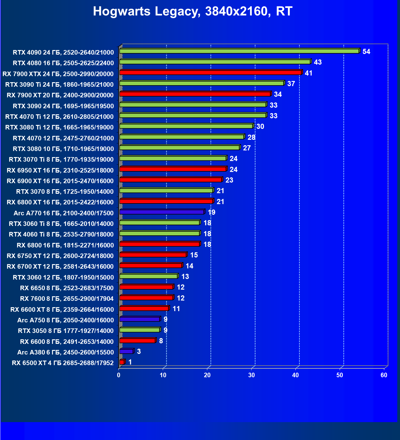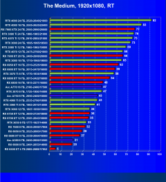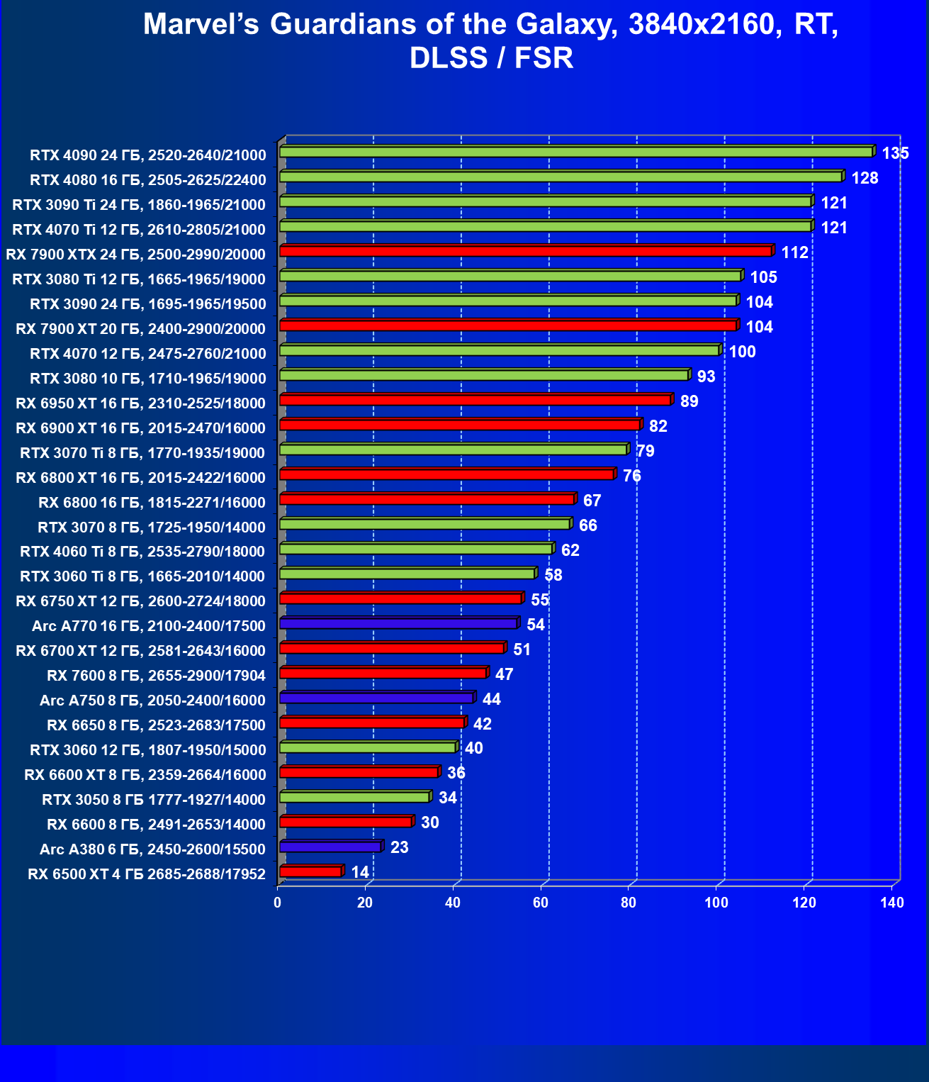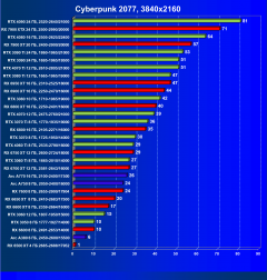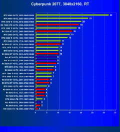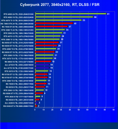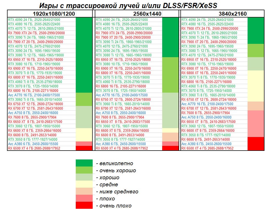 Логично, что RT даже с «подпорками» в виде FSR/XeSS для семейства карт AMD является менее перевариваемым, нежели для RTX, поэтому RX 69xx уступили, уйдя в аутсайдеры. При этом RTX 4070 оказался выше RTX 3080 Ti из-за поддержки первым DLSS 3.0. Уже первый «звоночек» против RTX 3080 Ti.