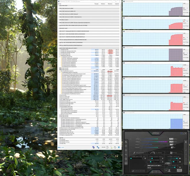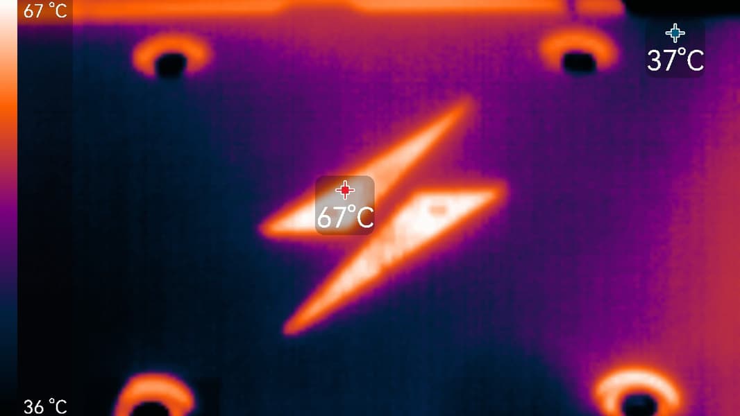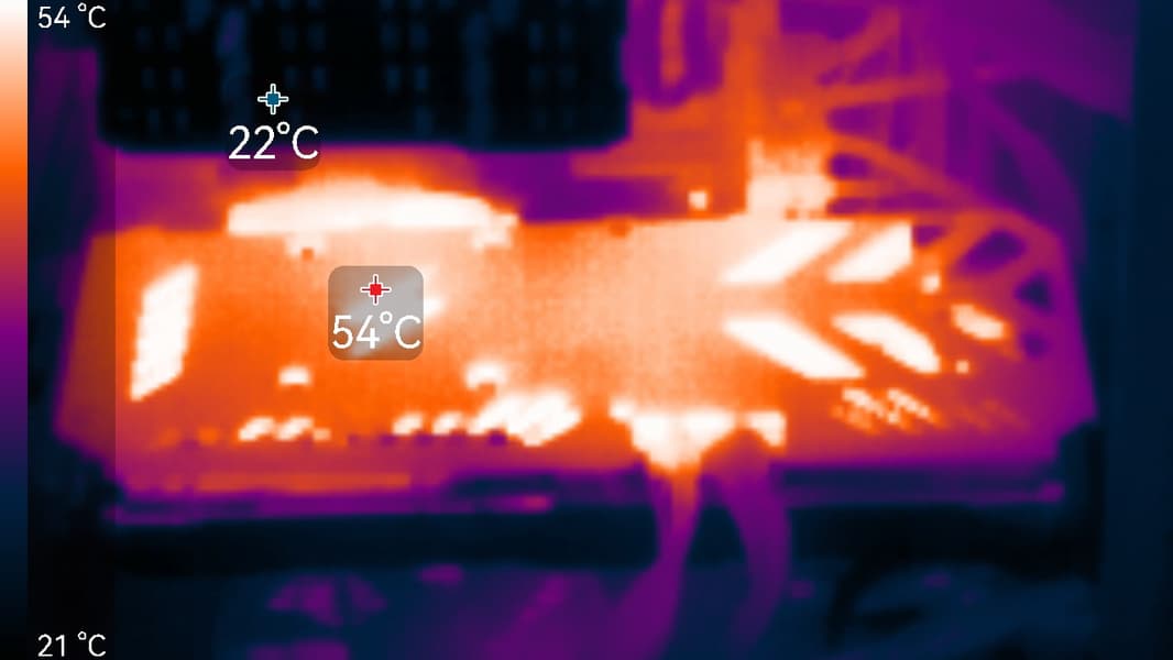 После 2-часового прогона под нагрузкой максимальная температура ядра не превысила 67 градусов (самой горячей точки — 88 °C), а температура микросхем памяти — 72 градусов, что является удовлетворительным результатом для видеокарт такого уровня. Энергопотребление карты доходило до 350 Вт. Напомним, что безопасный предел нагрева памяти GDDR6X — 105 °C.