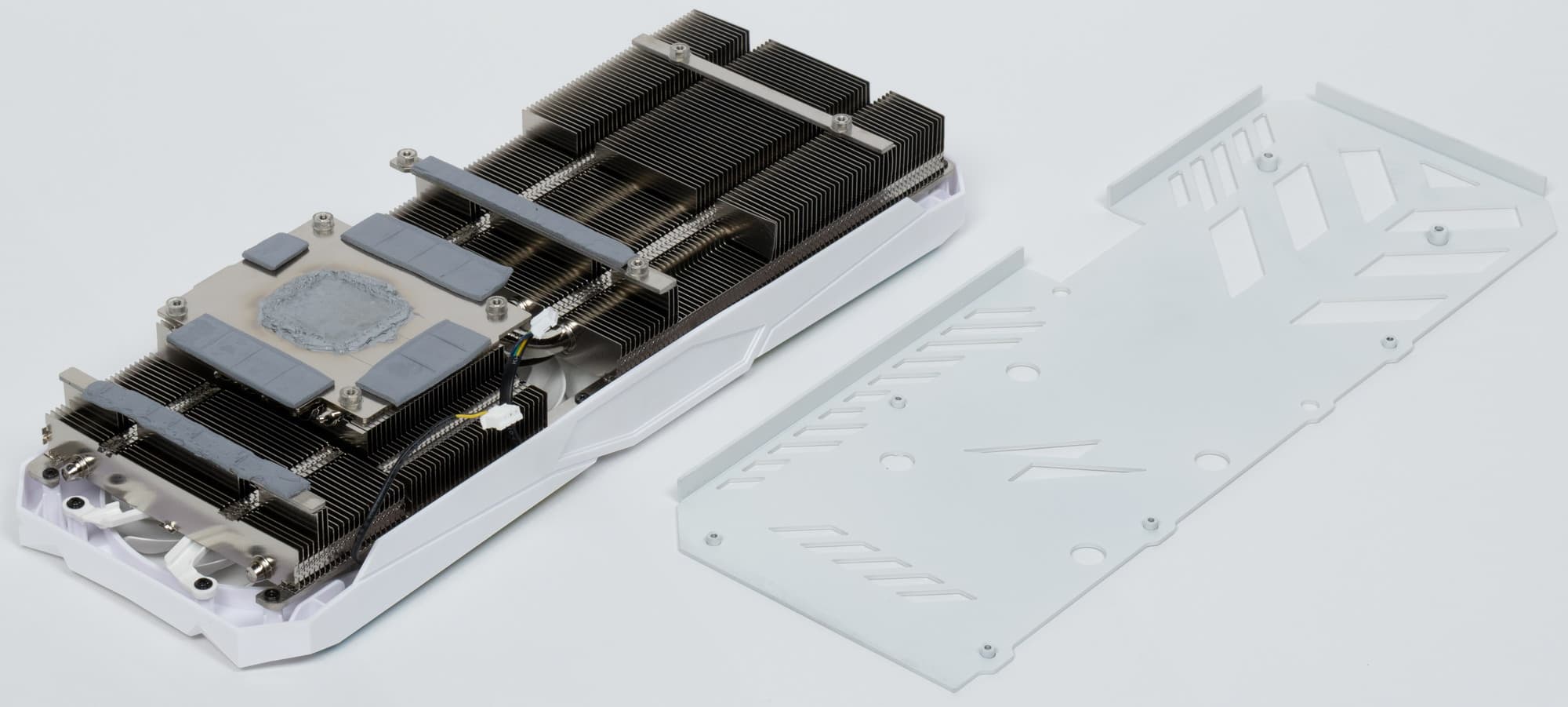 Трубки припаяны к большой медной и никелированной пластине, которая охлаждает как ядро, так и микросхемы памяти (через термопрокладки). А для охлаждения преобразователей питания VRM имеется своя подошва на радиаторе.