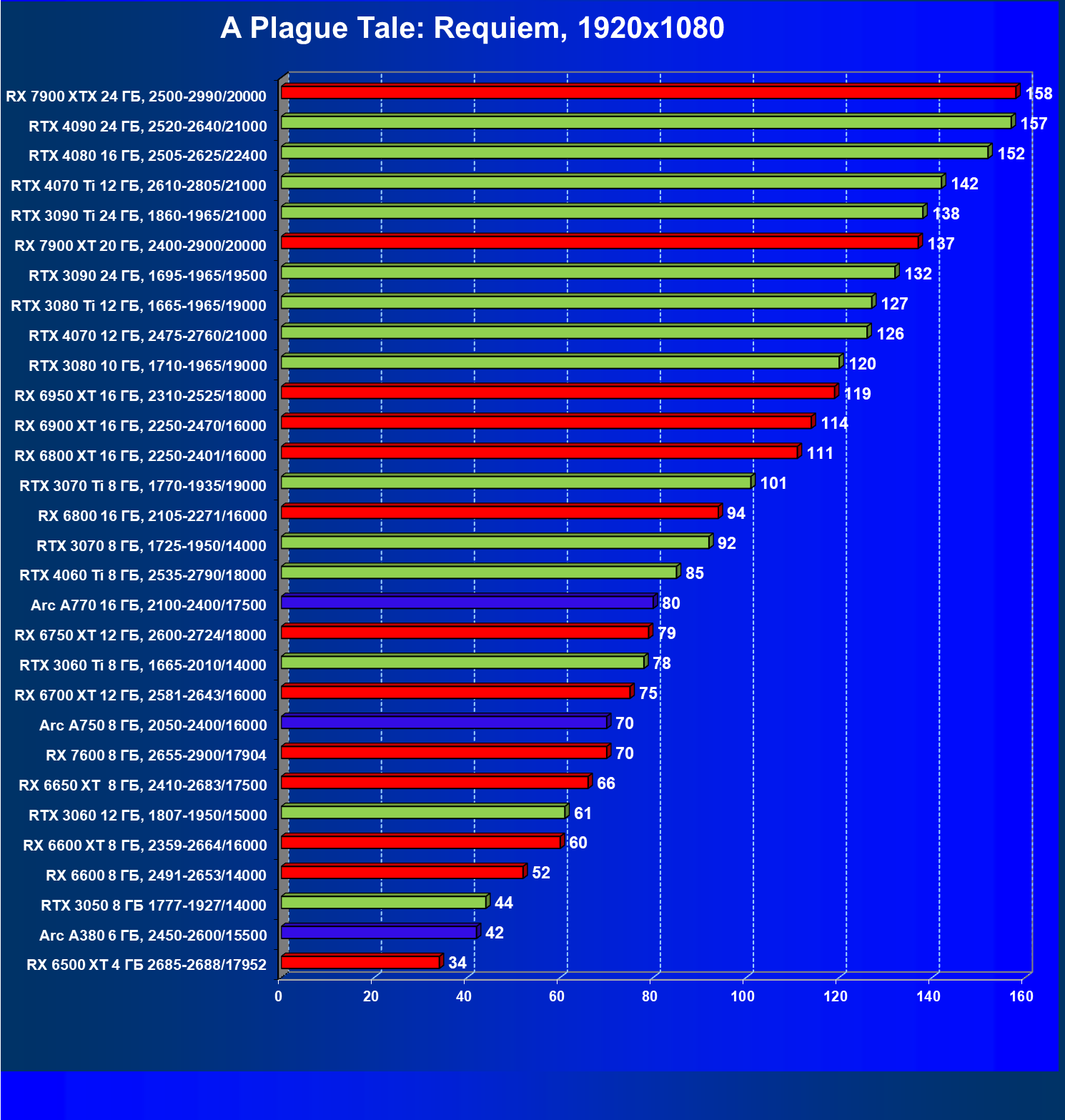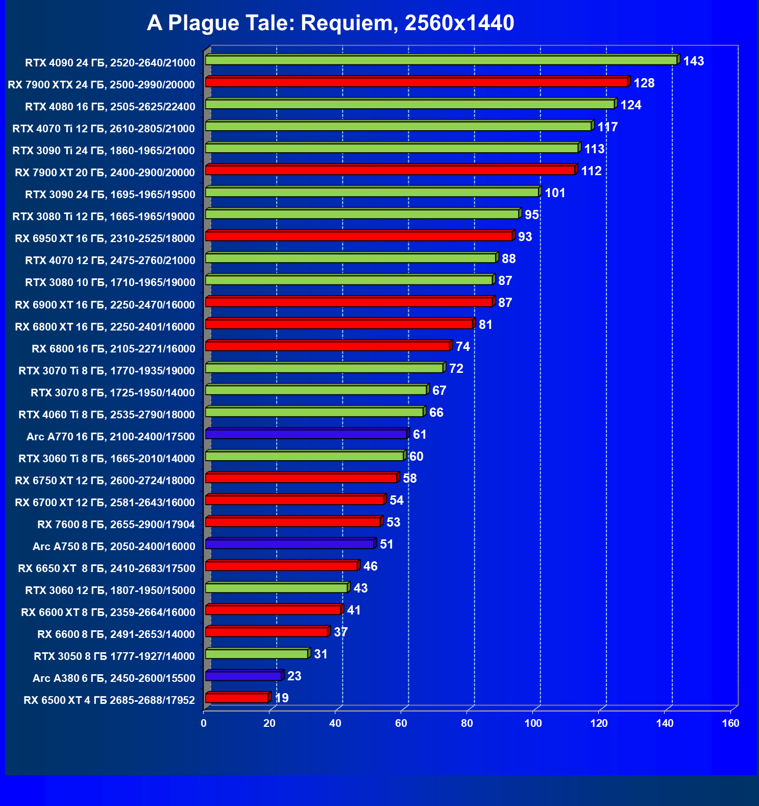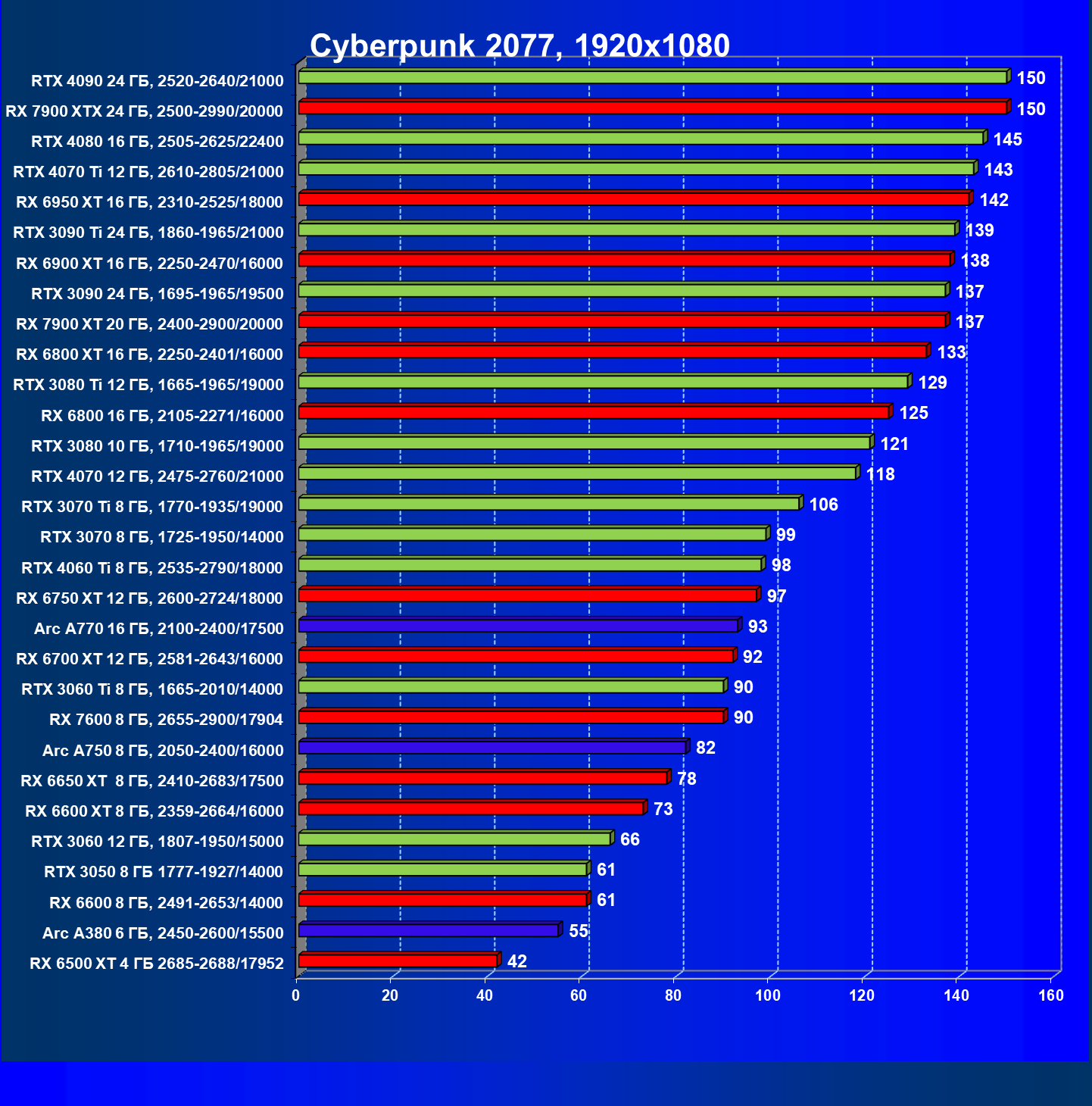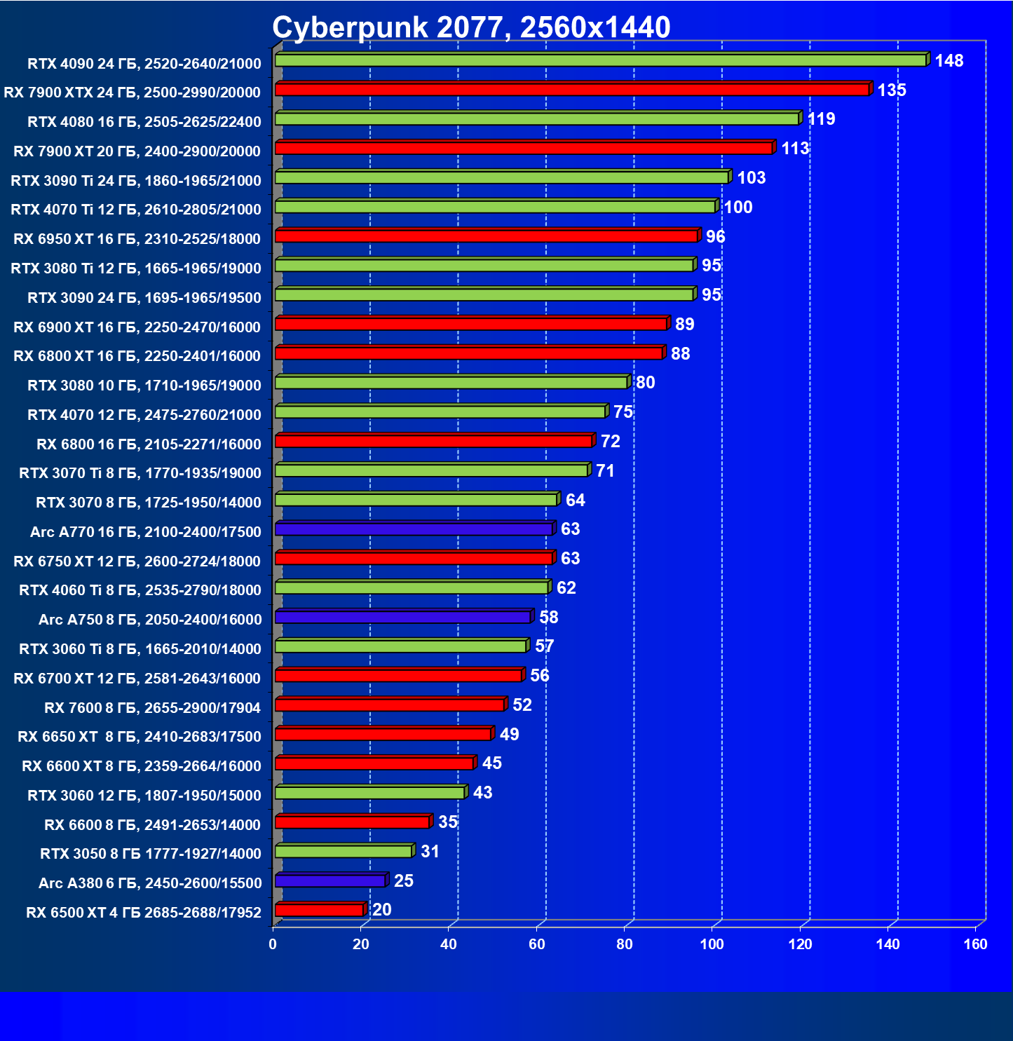 | 20 | RX 7900 XT 20 ГБ, 2400—2900/20000 | 78 | 588 | 75 000 |