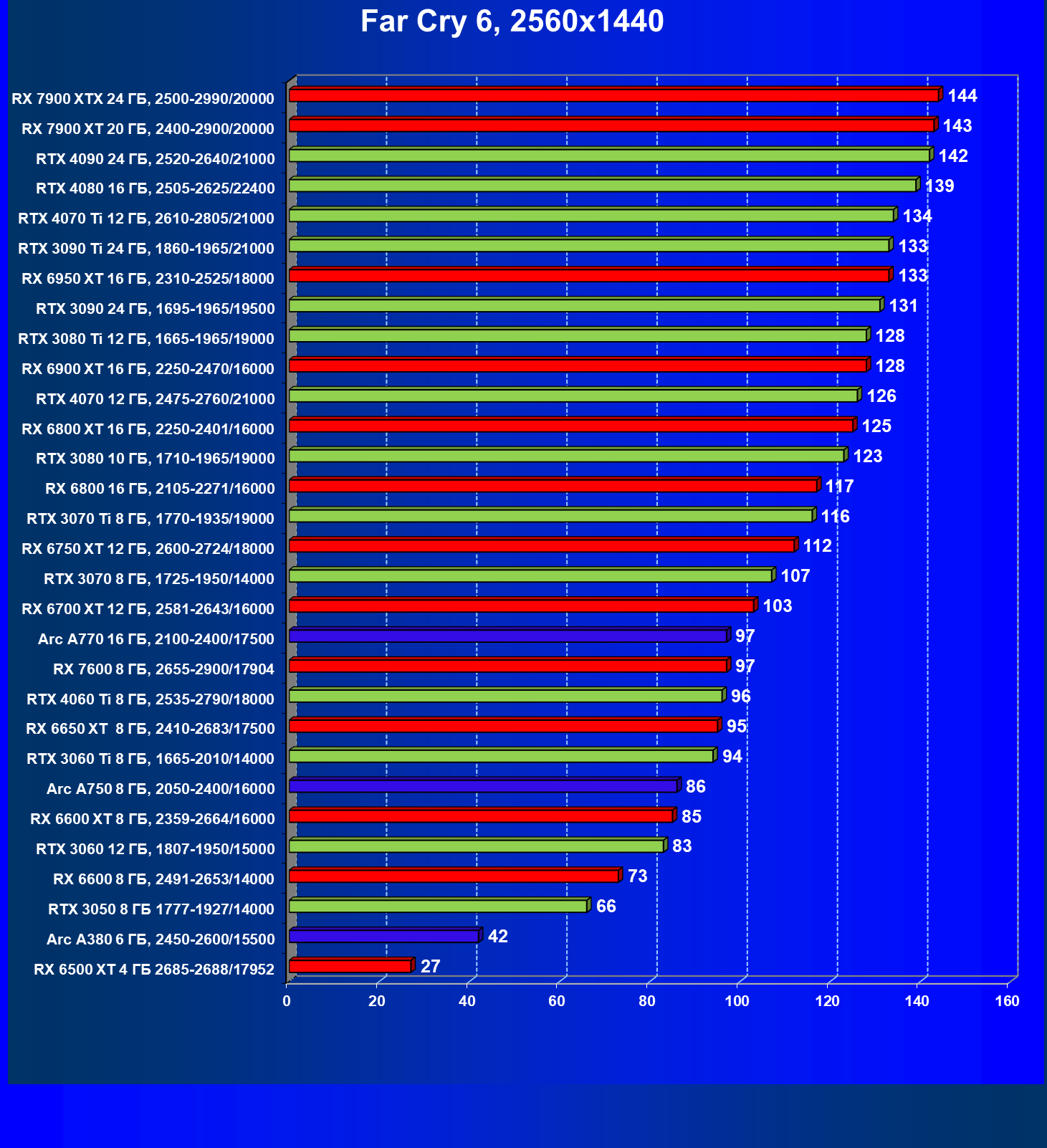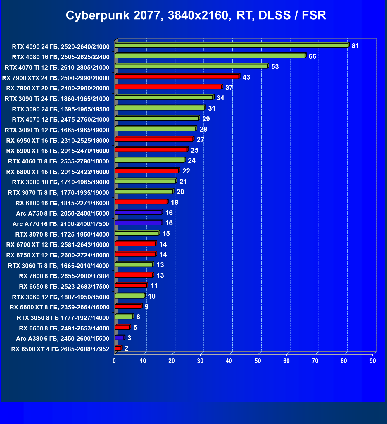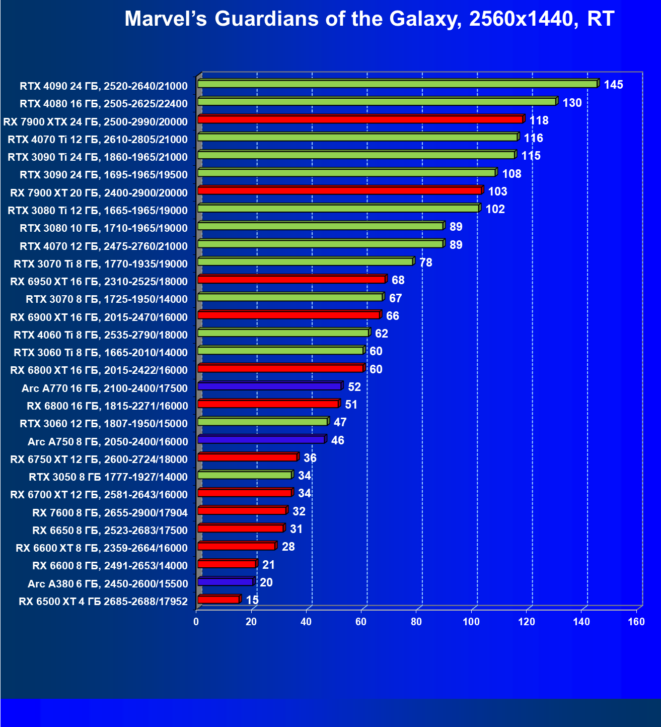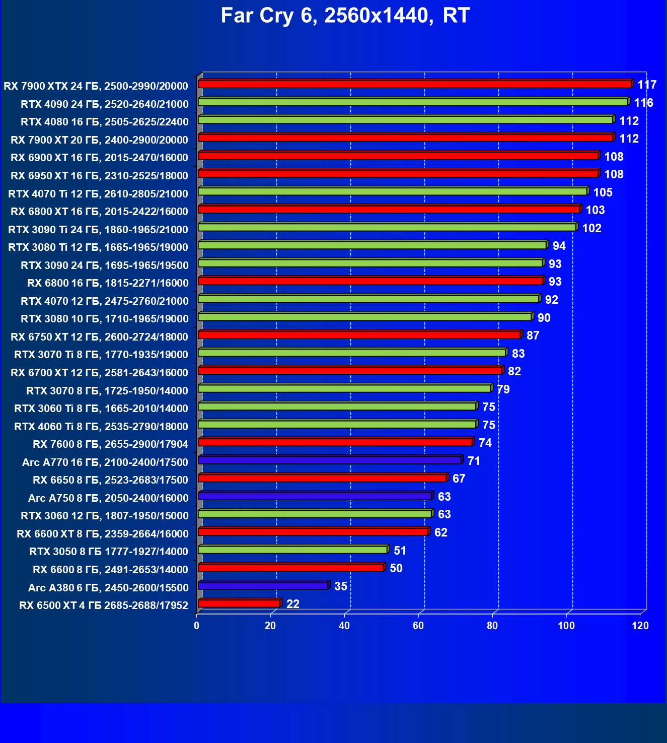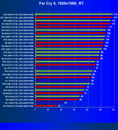 | 25 | RX 6950 XT 16 ГБ, 2310—2525/18000 | 93 | 667 | 72 000 |