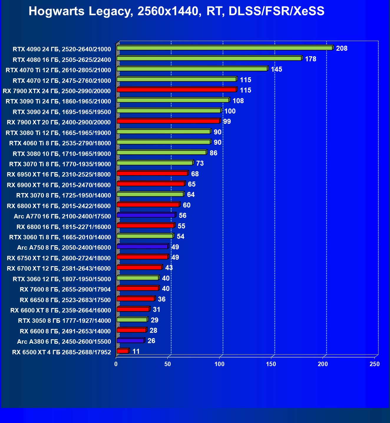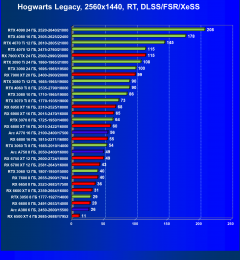 Результаты тестов со включенной аппаратной трассировкой лучей и/или DLSS/FSR/XeSS в разрешениях 1920×1080, 2560×1440 и 3840×2160