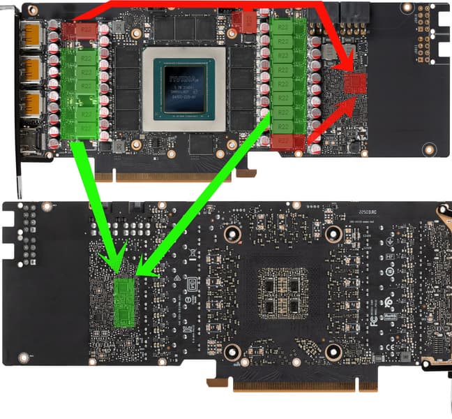 Зеленым цветом отмечены фазы питания графического ядра, а также их ШИМ-контроллеры, а красным — то же для микросхем памяти. Для управления схемой питания ядра используются два ШИМ-контроллера uP9511R (uPI Semiconductor), каждый из которых способен управлять максимум 8 фазами. Оба расположены на оборотной стороне платы.