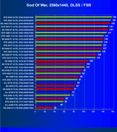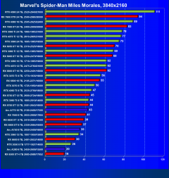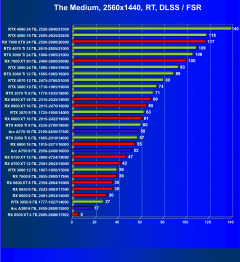 Рейтинг составлен по 9 тестам, в которых используется технология трассировки лучей и одновременно технология Nvidia DLSS, AMD FSR или Intel XeSS. Этот рейтинг нормирован по самому слабому ускорителю в данной группе — Radeon RX 6500 XT (то есть сочетание скорости и функций Radeon RX 6500 XT приняты за 100%).