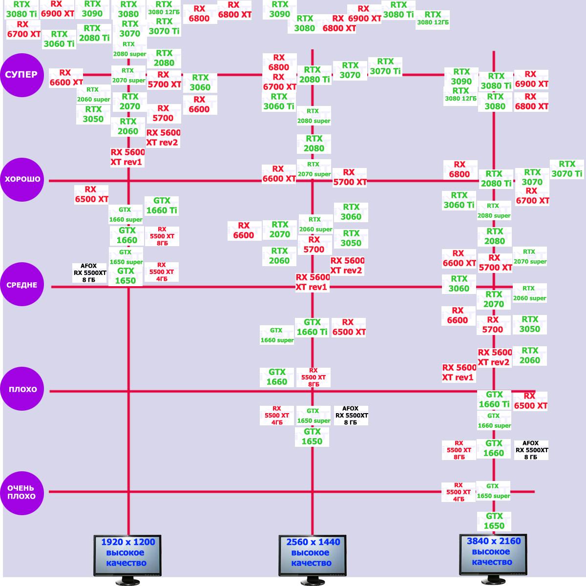 | 16 | RX 5500 XT 8 ГБ, 1755—1867/14000 | 100 | 43 | 23 000 |