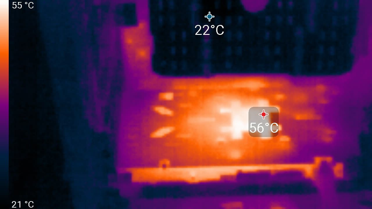В простое температура была не выше 33 °C, вентиляторы не работали, уровень шума был равен фоновому — 18 дБА.