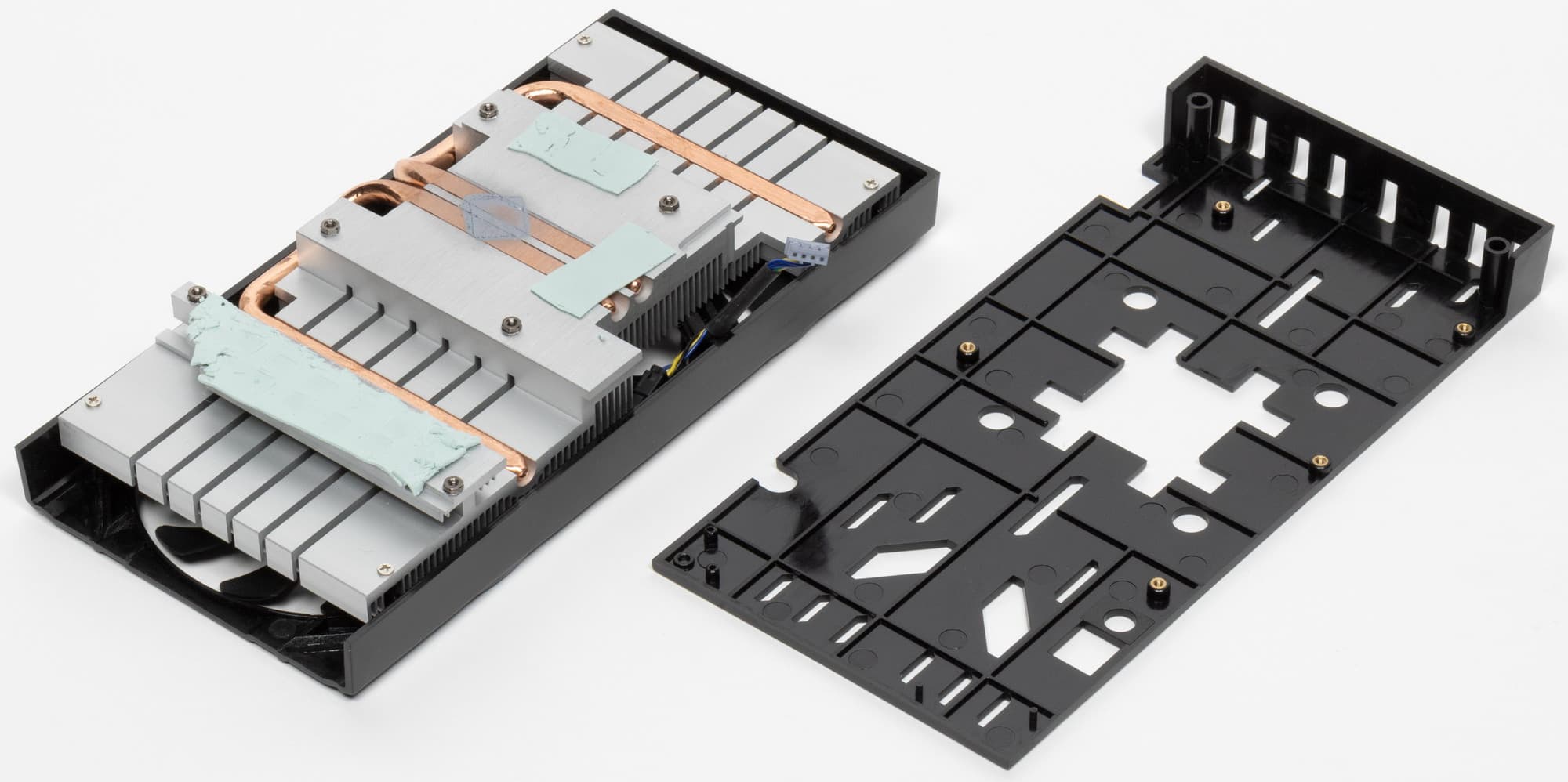 Основой СО является довольно простой пластинчатый алюминиевый радиатор с парой тепловых трубок, впрессованных в подошву прямого контакта с GPU и микросхемами памяти (с помощью термоинтерфейса). Этот же радиатор служит охладителем и для компонентов преобразователей питания VRM с помощью небольшой подошвы. Для мосфетов VRM памяти охлаждение не предусмотрено.