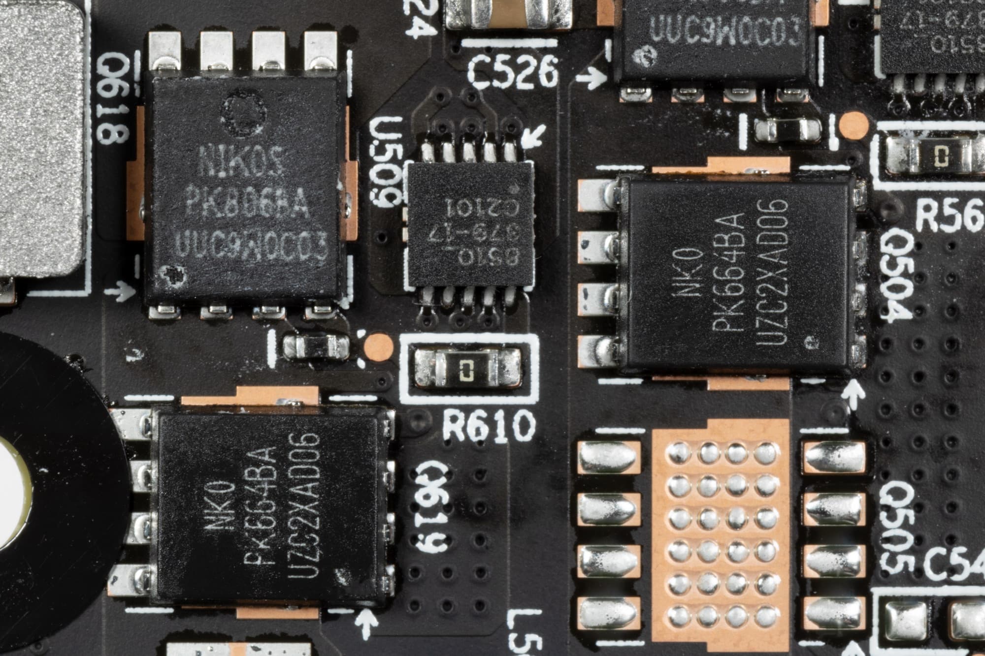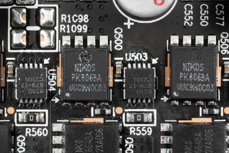 В схеме питания ядра у карты Afox использованы современные твердотельные конденсаторы, однако уже привычных транзисторных сборок DrMOS нет, а мы видим наборы из полевых транзисторов PK664BA и PK806BA от Niko Semi (54 А).
