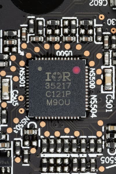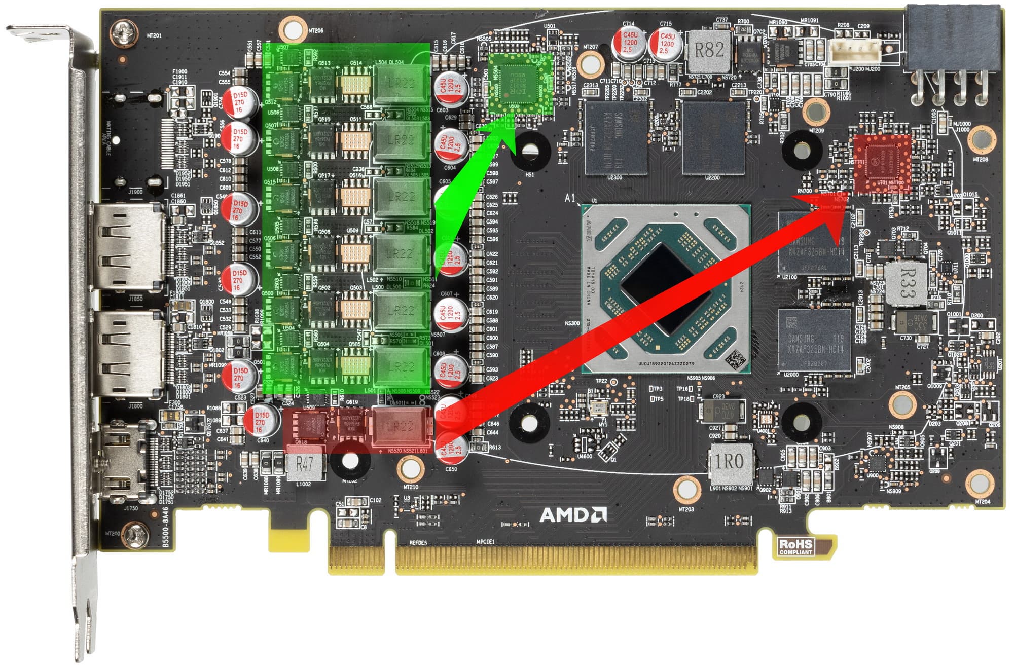 Зеленым цветом отмечена схема питания ядра, красным — памяти. Для управления схемой питания GPU используется ШИМ-контроллер IR35217 (Infineon, ex-International Rectifier).