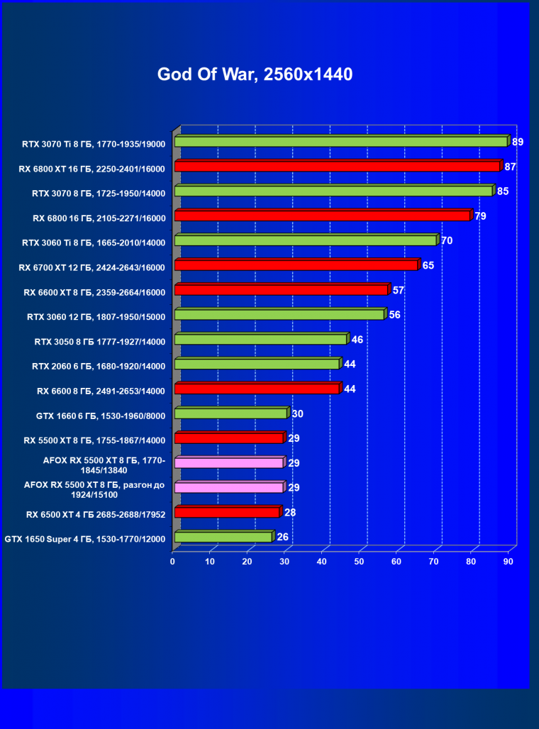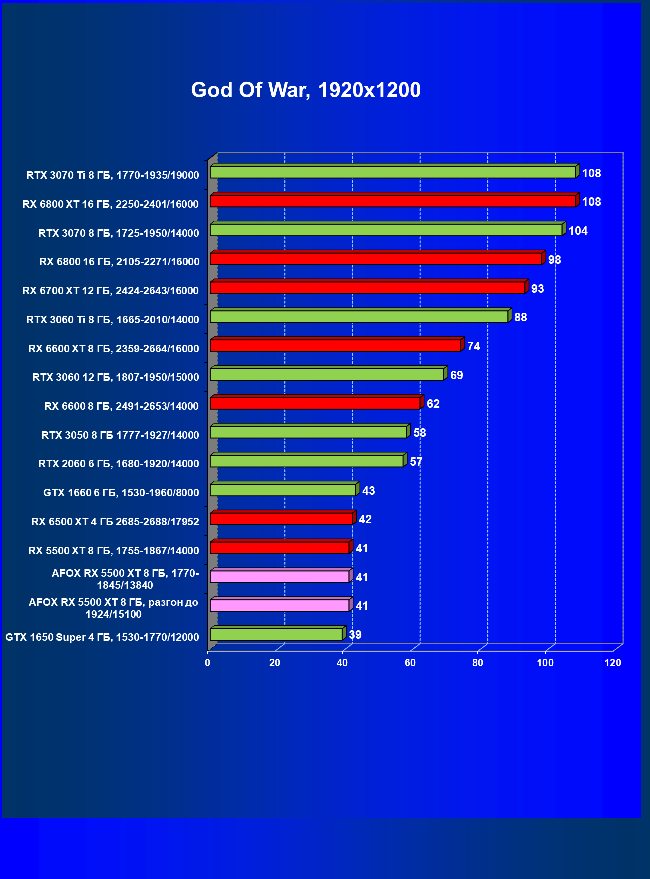 | 17 | GTX 1650 Super 4 ГБ, 1530—1770/12000 | 90 | 41 | 22 000 |