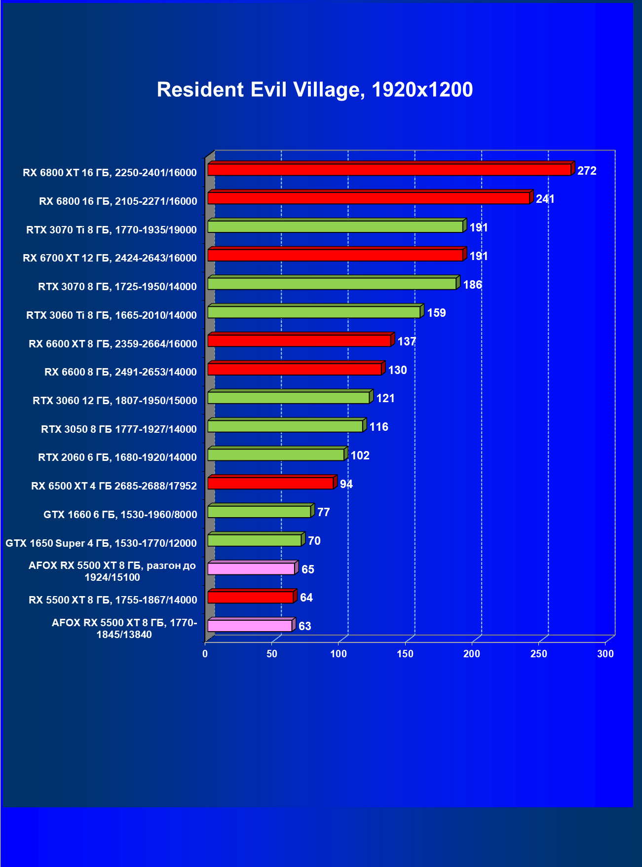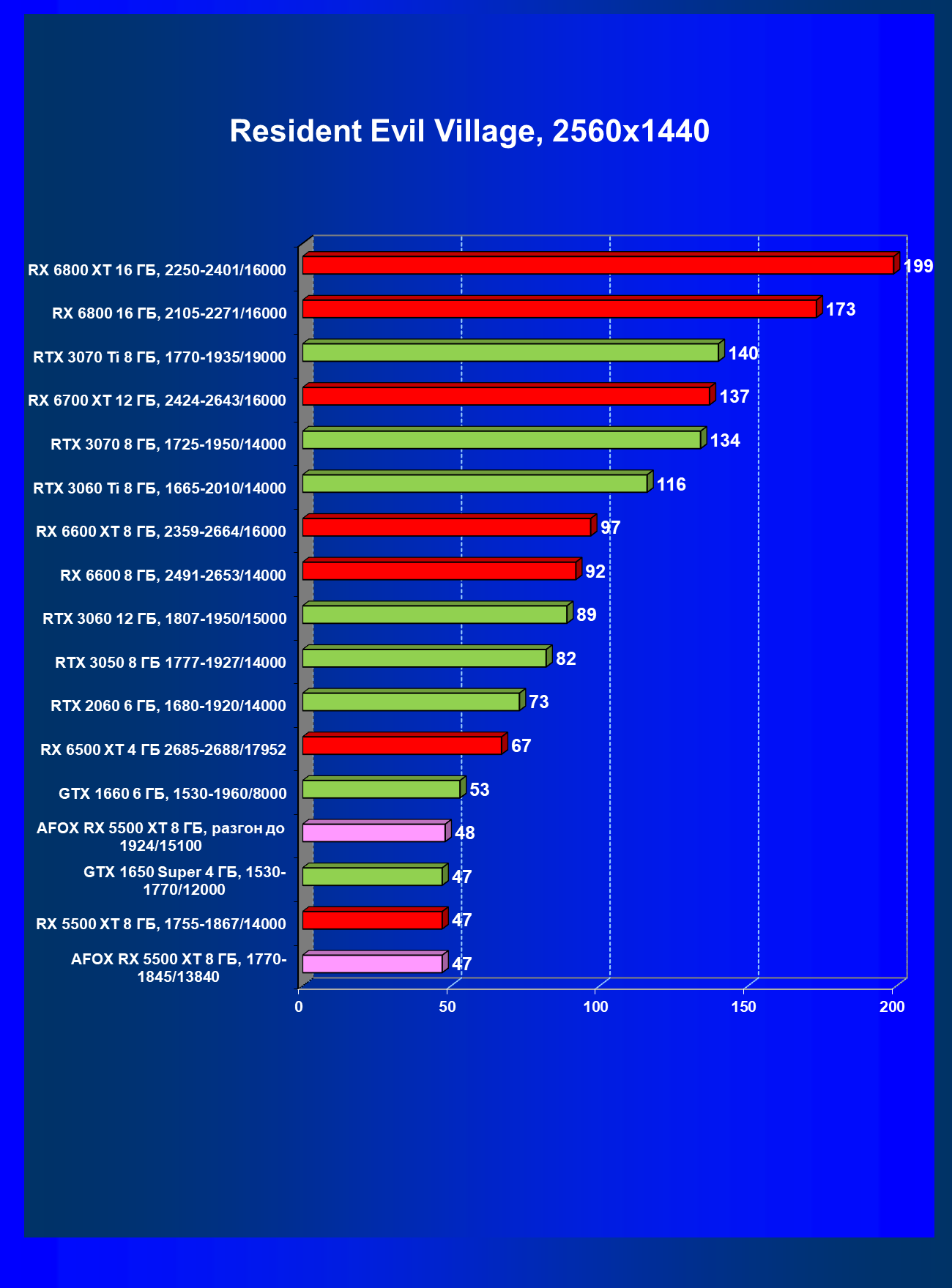 Хорошо видно, что в плане производительности Radeon RX 5500 XT 8 ГБ и GeForce GTX 1660 где-то рядом (и если вспомнить прошлые тесты RX 5500 XT двухлетней давности, то тогда GTX 1660 даже чуть отставал, вот что делают оптимизации в драйверах). GTX 1650 Super не сильно отстает, однако наличие всего 4 ГБ памяти сильно бьет по интересу к приобретению такой карты сегодня.