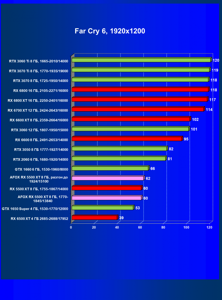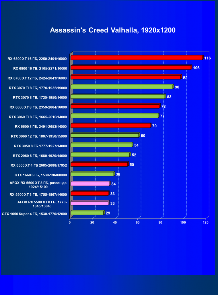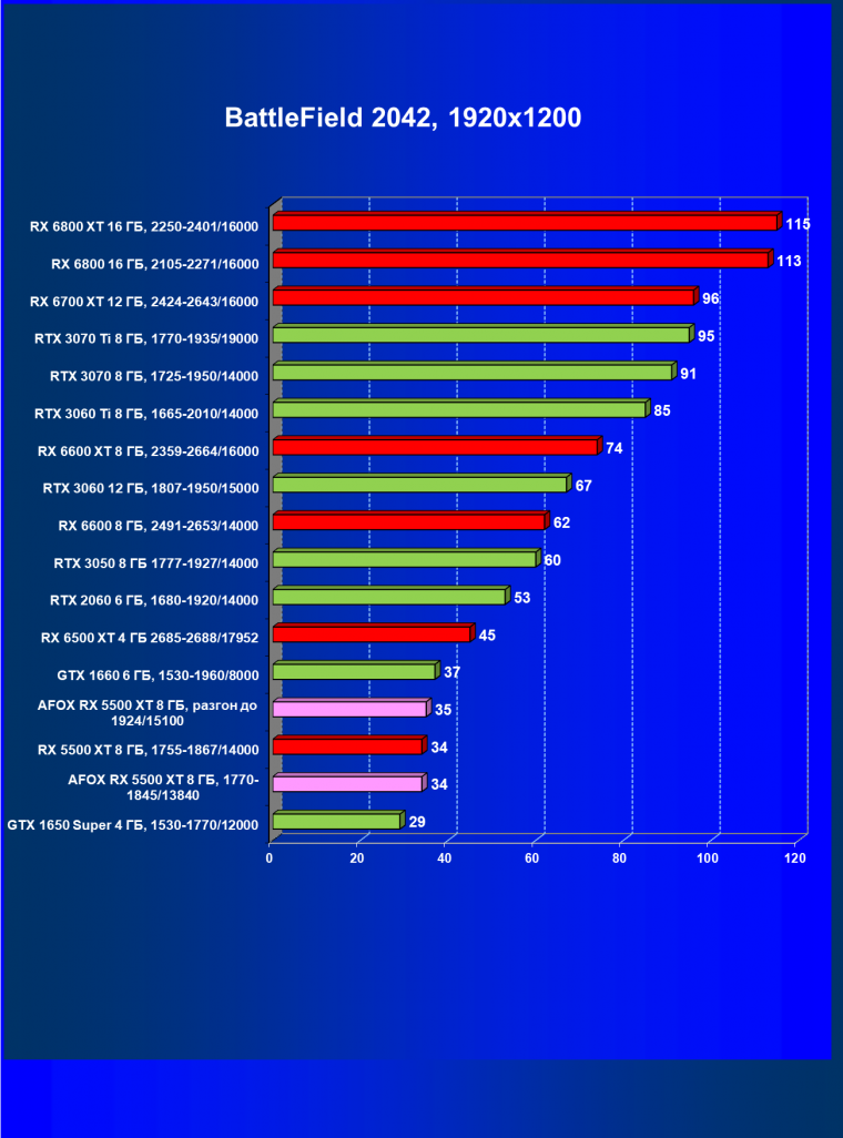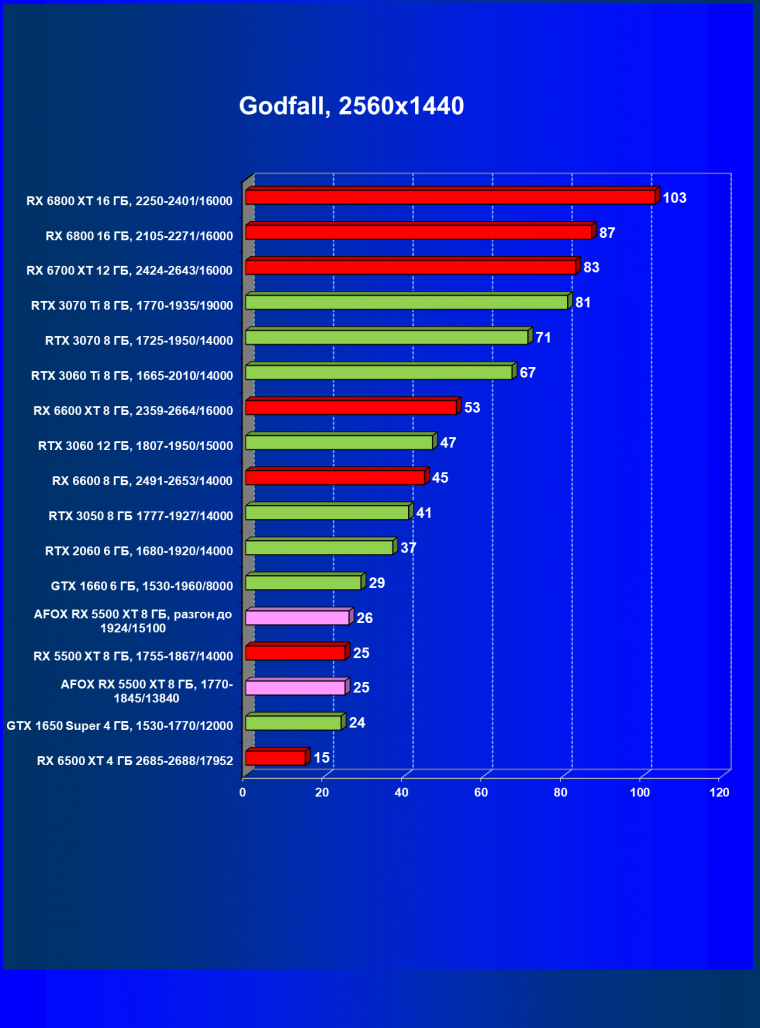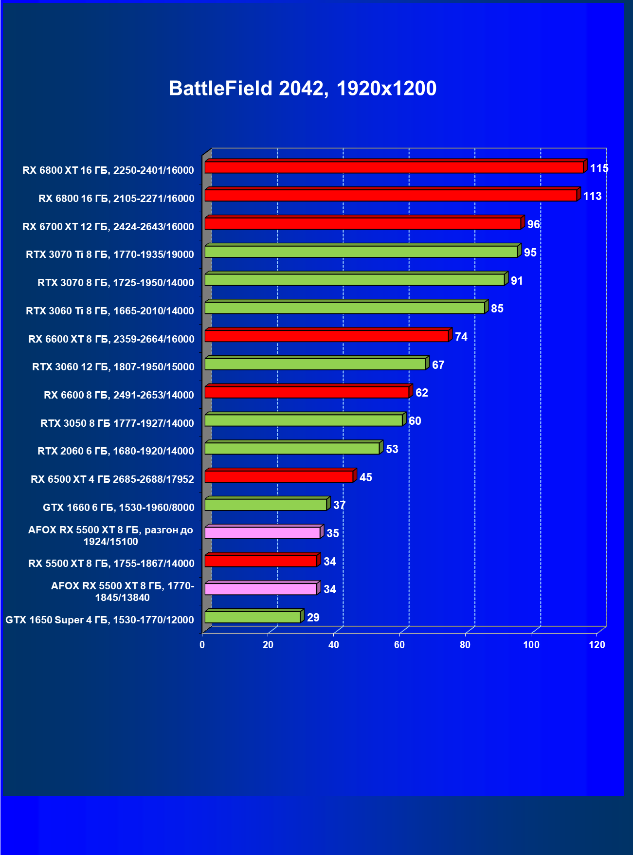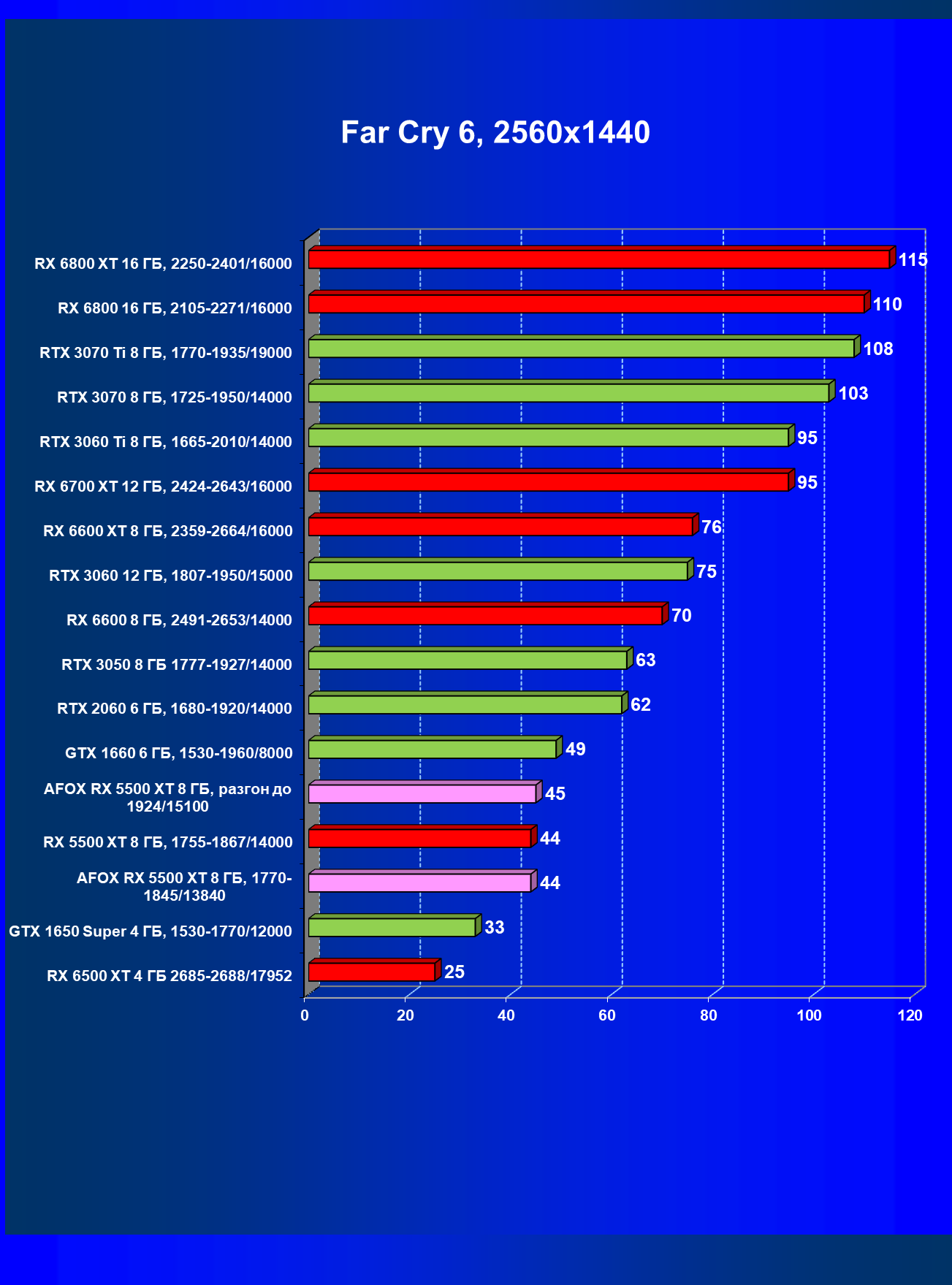 | 11 | RX 5500 XT 8 ГБ, 1755—1867/14000 | 43 | 100 | 23 000 |