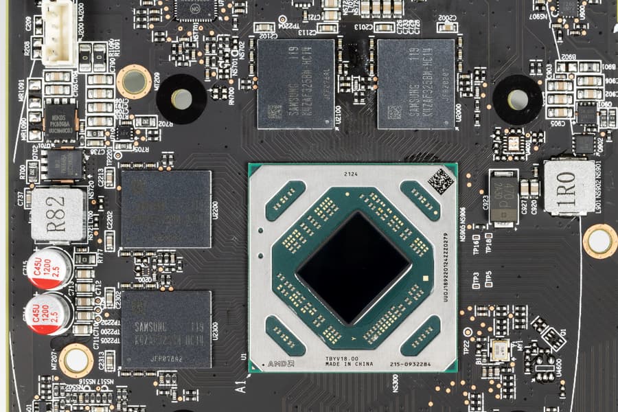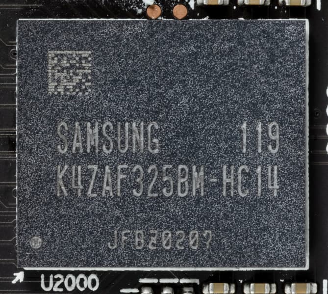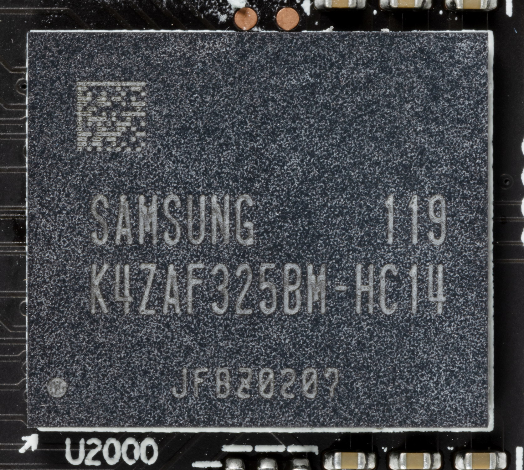 Карта имеет 8 ГБ памяти GDDR6 SDRAM, размещенной в 4 микросхемах по 16 Гбит на лицевой стороне PCB. Микросхемы памяти Samsung (GDDR6) рассчитаны на условную номинальную частоту работы в 3500 (14000) МГц.