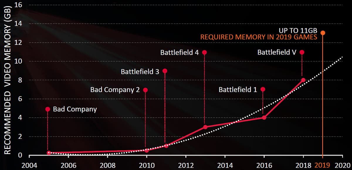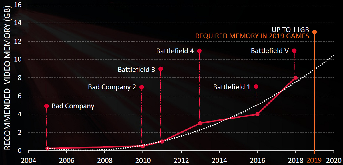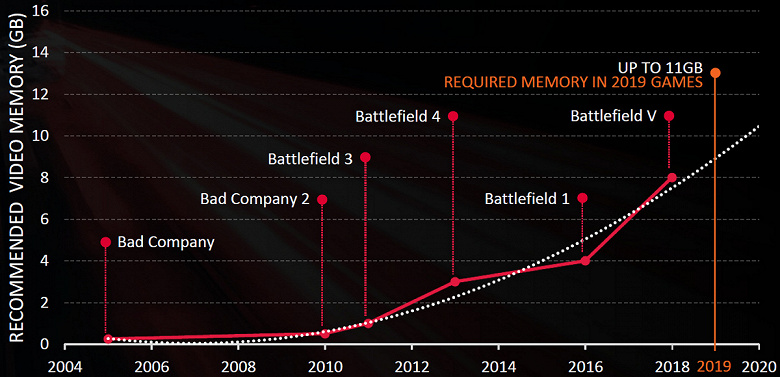 По данным компании AMD на примере серии игр Battlefield, которые приведены выше, можно увидеть, что еще три года назад рекомендуемым объемом VRAM было 4 ГБ собственной графической памяти, но уже к 2018 году рекомендации выросли вдвое — до 8 ГБ. То же самое касается и многих других современных проектов, которые любят занимать всю имеющуюся видеопамять, чтобы не требовалась частая подгрузка ресурсов игры с накопителя. И если объема видеопамяти недостаточно, то играть становится некомфортно, частота кадров сильно падает и при игре наблюдаются неприятные рывки.