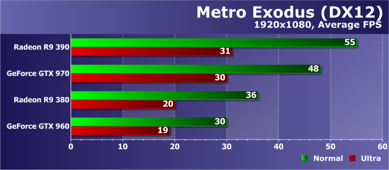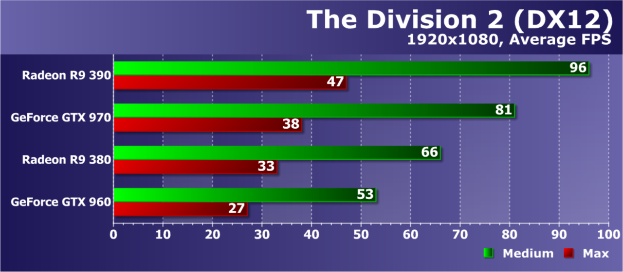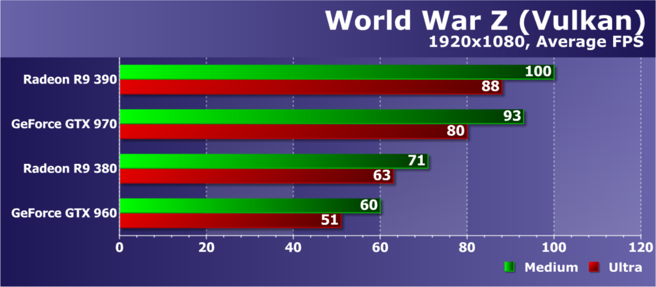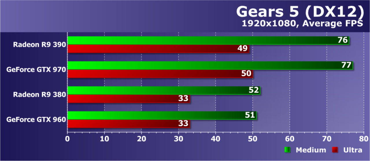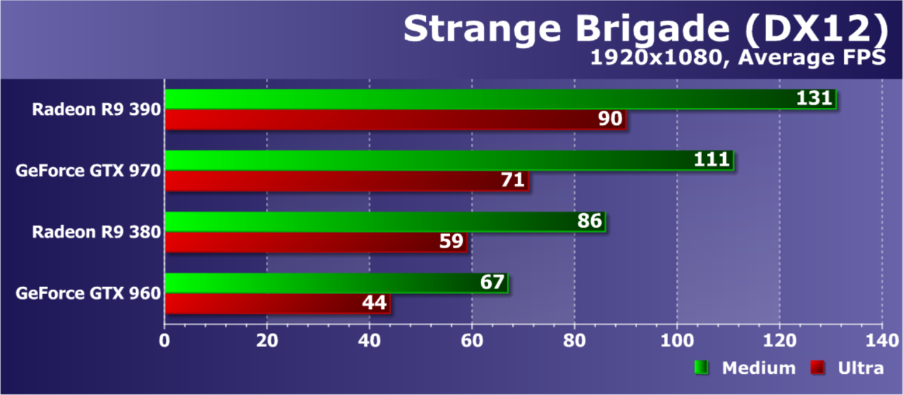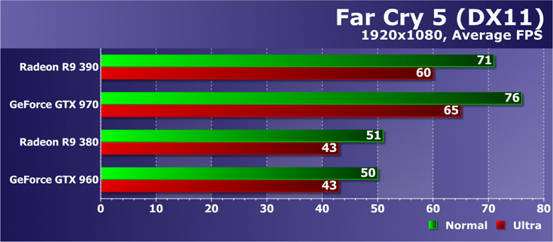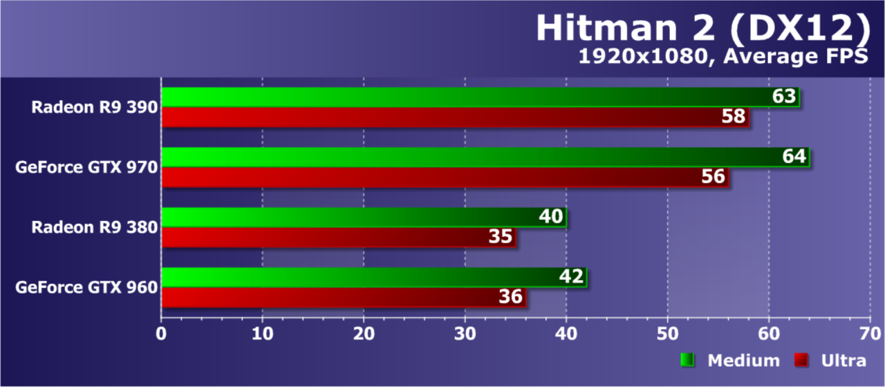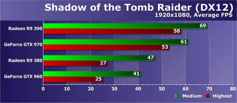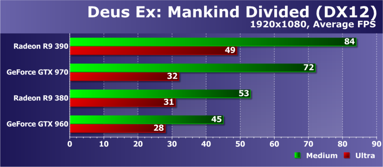 Игра очень требовательна к мощности GPU, и среднеценовая пара устаревших видеокарт не смогла показать приемлемой частоты кадров даже при средних настройках, хотя Radeon R9 380 была явно ближе к обеспечению играбельности, по сравнению с GeForce GTX 960. Ультра-настройки недоступны и для старших GPU пятилетней давности, ну а при средних Radeon R9 390 лишь немного не хватило до 60 FPS, а GTX 970 явно уступила сопернику. По последним играм явное преимущество у AMD.