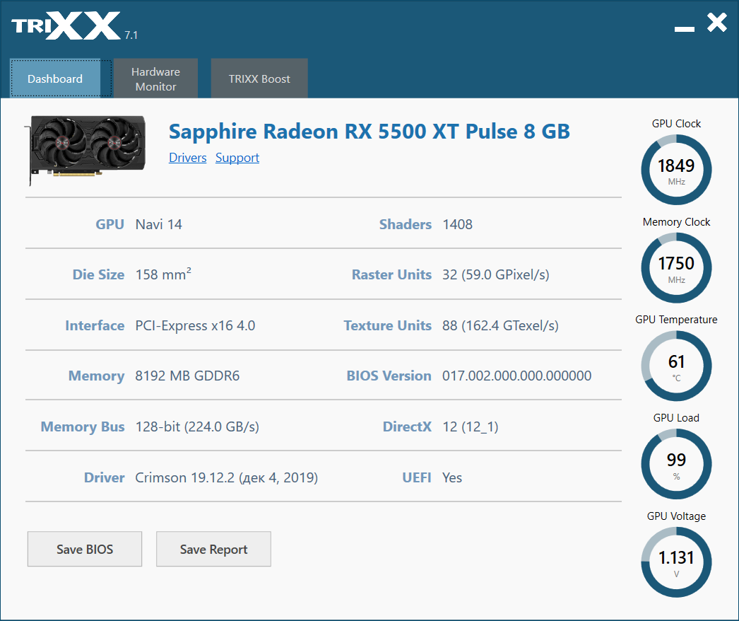 Про конкретные протестированные карты Sapphire (Pulse RX 5500 XT 4G и Pulse RX 5500 XT 8G) можем добавить еще, что у них практически отсутствует шум системы охлаждения, при этом вентиляторы можно снимать для чистки без демонтажа всей СО. Карты имеют компактные размеры, а отсутствие подсветки типично для серии Pulse, и для кого-то это будет даже достоинство, а не недостаток. (За подсветкой — это к картам серии Nitro у того же Sapphire.) Также стоит напомнить про фирменную технологию Sapphire — Trixx Boost, позволяющую поднять производительность за счет рендеринга картинки в более низком разрешении, но без снижения настроек качества графики. Потребитель может сам решать, нужно ему это или нет.