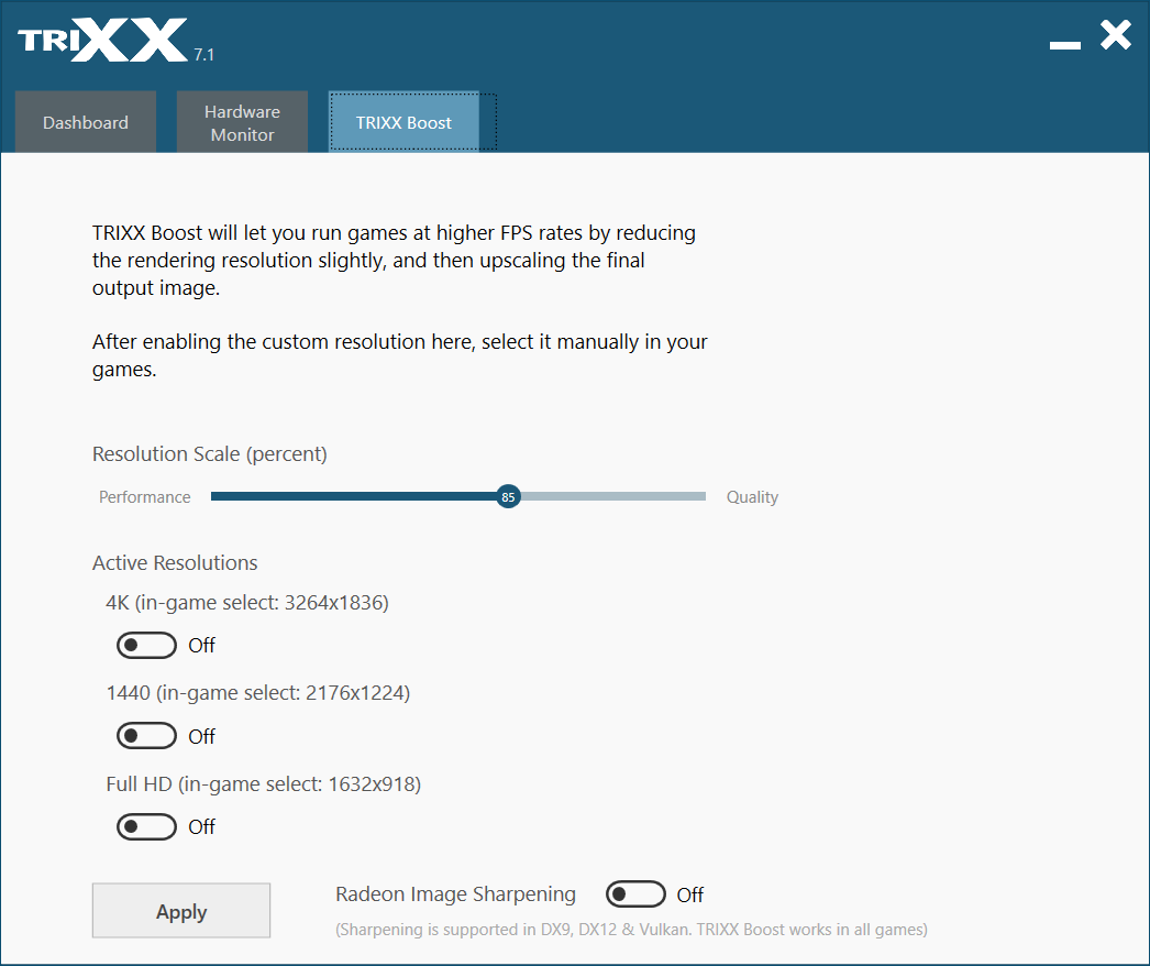 В настройках драйвера задается минимально возможное разрешение в процентах от нормального (50%, 67% или 84%), и падение качества на вид должно быть почти неразличимым при заявленном повышении отзывчивости при игре. Пока что технологией поддерживается весьма ограниченный набор игр: Overwatch, PUBG, Borderlands 3, последние две игры серии Tomb Raider, Destiny 2, GTA 5 и Call of Duty: WWII — и все они только в DirectX 11-версиях, на данный момент. Технология работает на видеокартах, начиная с Radeon RX 400 (Polaris) и Raven Ridge APU.